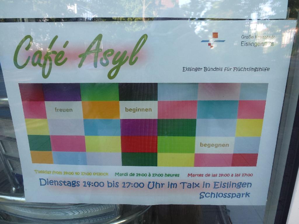 Bei Bilderbuchwetter startete heute nachmittag das erste 'Café Asyl' im Eislinger Jugendzentrum TaLX. Elena Kühne, die von der Stadt angestellte Betreuerin, war völlig zufrieden mit der Teilnahme der Asylpaten wie auch mit der Teilnahme der Flüchtlinge. In gemischten Runden fanden intensive Gespräche statt und der gespendete Kuchen mundete allen, auch der georgischen Oma, die ihren 75sten Geburtstag heute feiern konnte. Das offizielle Plakat |