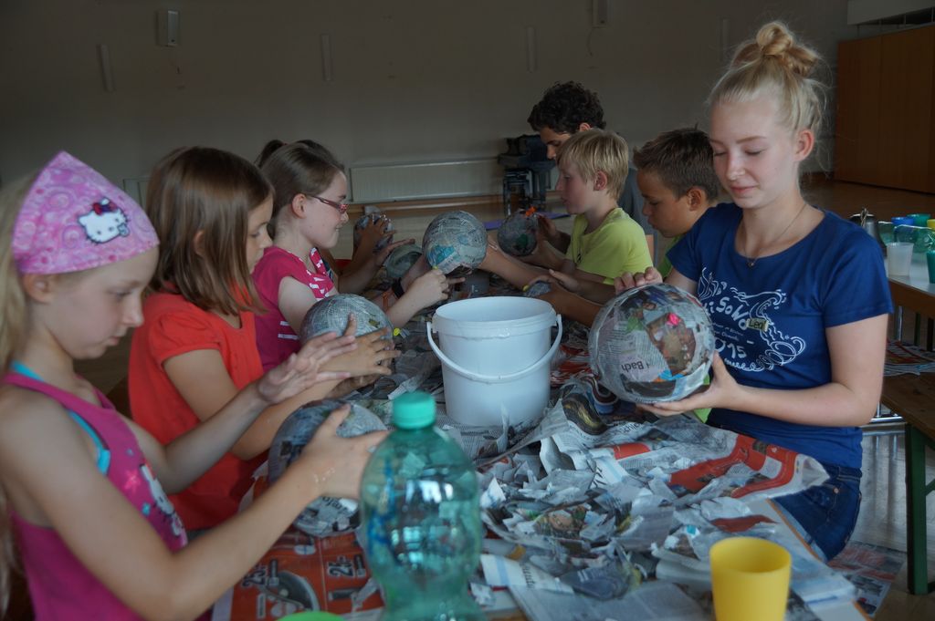 'Hoffentlich wird es kühler, sonst können die Heissluftballone nicht gut steigen.' Eine interessante Betrachtungsweise des aktuellen Wetters von Jakob, einen der Mitarbeiter der KiSoWo (Kindersommerwoche) des evangelischen Jugendwerks in Eislingen. 64 Kinder werden von 16 Mitarbeiterinnen und Mitarbeitern rund um das evangelische Gemeindehaus der Lutherkirche in Eislingen in der vorletzten Sommerwoche betreut. Die Ballonbauer bei der Arbeit |