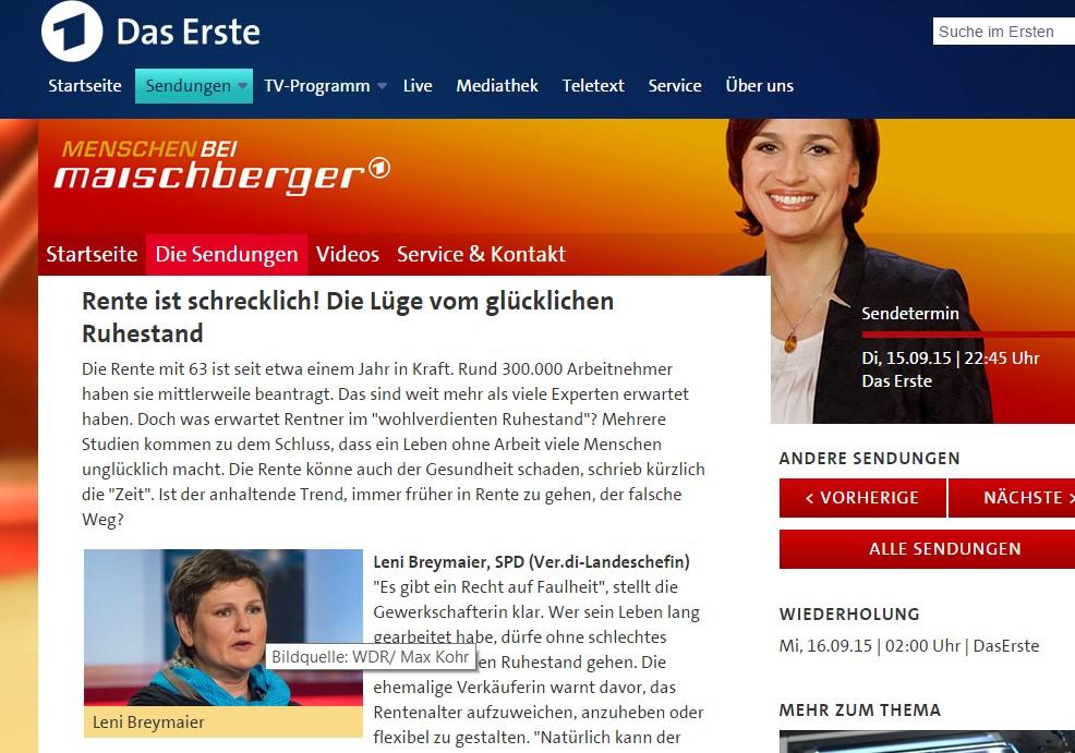 Menschen bei Maischberger mit Leni Breymaier aus Eislingen Rente ist schrecklich! Die Lüge vom glücklichen Ruhestand 15.9.2015 - Redaktion