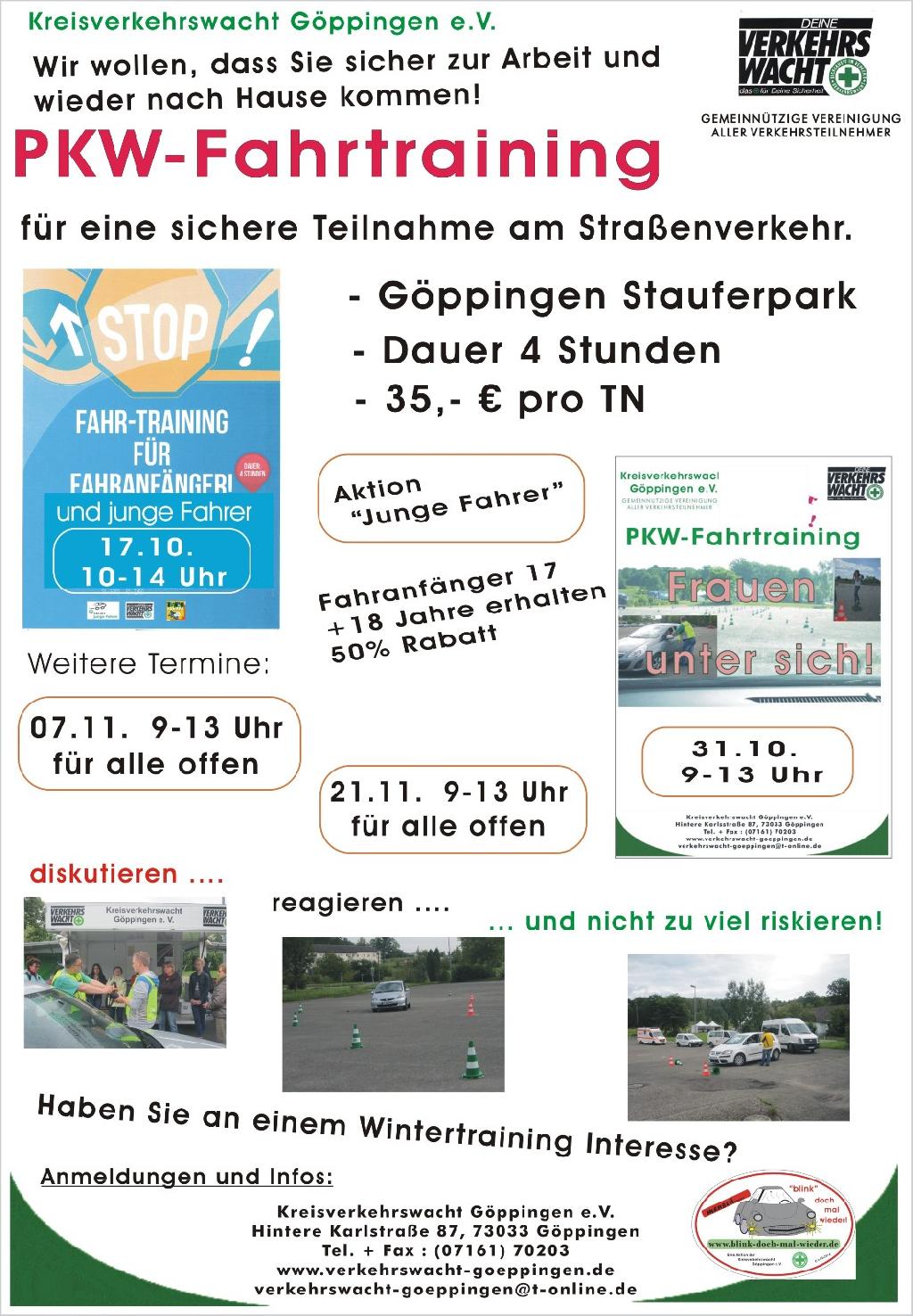 Diese Auflistung könnte man mit vielen Punkten erweitern. Die Kreisverkehrswacht Göppingen möchte hier ihre Erfahrung über bald 60 Jahre einbringen und bietet Fahrtrainings-Kurse an, die alle Verkehrsteilnehmer ansprechen sollen.