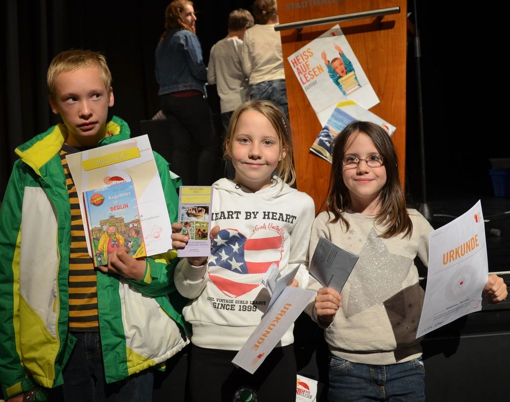 Um an der Preisverleihung teilzunehmen, konnten sich die Kinder aus fast 500 Büchern die lustigsten, abenteuerlichsten oder gruseligsten zum Ausleihen auswählen. Für die „Heiss auf Lesen“ - Teilnehmer begannen darauf viele spannende Reisen in die Welten zwischen den Buchdeckeln. Um die Eindrücke, Erlebnisse oder Abenteuer und Geschichten der gelesenen Bücher festzuhalten, waren die Teilnehmer dazu aufgefordert, die beigelegten Postkarten auszufüllen. „Über 500 Postkarten haben die Stadtbücherei aus vielen verschiedenen Lesewelten erreicht“, freute sich Heike Stieper. In der Tat quoll der Briefkasten, der extra für die Aktion an der Theke der Stadtbücherei aufgestellt war manches Mal fast über. Heike Stieper ließ es sich nicht nehmen und las einige der originellsten Kommentare dem Publikum vor. „Weil es sich lohnt zu lesen, “ oder „weil man nicht mehr aus dem Buch herausgehen will“, bis zu neuen Wortkreationen, „das Buch ist einfach nur lesig“, zeigten, wie beliebt das Hobby Lesen bei den Kindern auch heute noch ist. Daher wird die gelungene Leseförderaktion mit Sicherheit auch im nächsten Jahr ihre Fortsetzung finden.