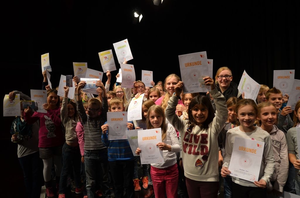 Nach einer kurzen Pause, bei der sich die Fußball- bzw. Lesefans mit Getränken und Brezeln stärken konnten, folgte der nächste Höhepunkt des Nachmittags: Die Übergabe der Urkunden und die Verlosung der tollen Preisen. Fast 70 Urkunden konnte Heike Stieper von der Stadtbücherei an die jungen fleißigen Leser verteilen. Viele strahlende Gesichter gab es bei der Verlosung der Preise für alle Teilnehmer, die mindestens drei Bücher gelesen hatten. Besonders begehrt waren auch in diesem Jahr die Büchergutscheine, die vom Stauferwerk zur Verfügung gestellt wurden.