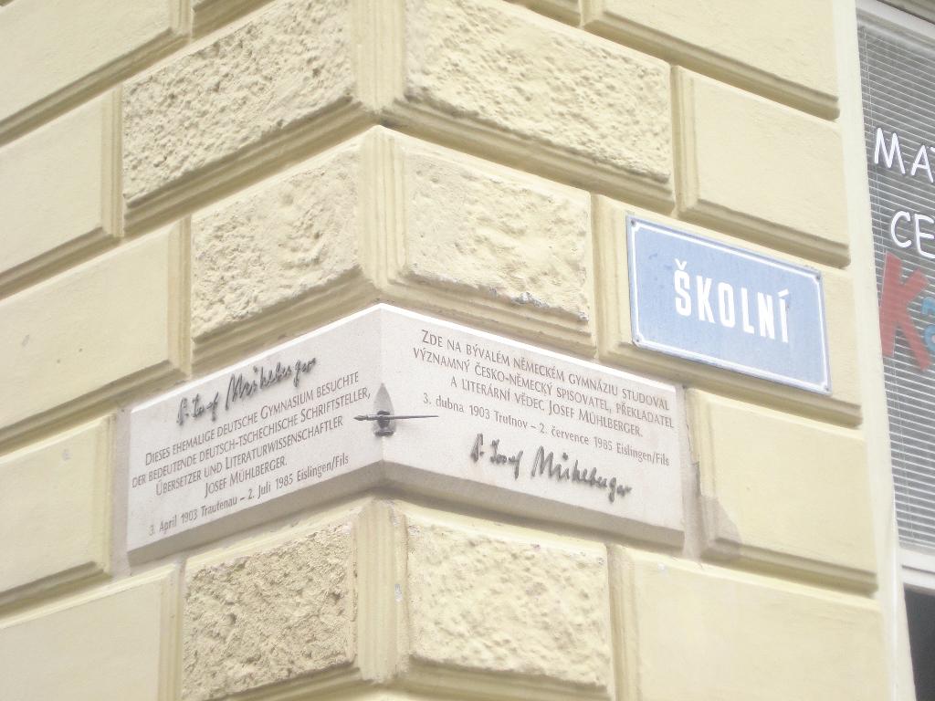Und im Jahr von Josef Mühlbergers 30. Todestag wurde nun richtig losgelegt! Eine Reihe von Veranstaltungen hat großes öffentliches Interesse geweckt. Ich zähle auf: Ein Übersetzungswettbewerb sollte Gymnasiasten verlocken, sich intensiv mit einem Mühlberger-Text zu befassen und wurde gut angenommen. Ein echtes ‚Event’ war es, als der von Mühlberger beschriebene ‚Korso’ nachgespielt wurde, der in den österreichisch-ungarischen Ländern (zu denen Böhmen bis 1918 gehört hat) Tradition gewesen ist. Man traf sich um 18 Uhr auf dem Marktplatz, um flanierend Kontakte zu pflegen, sich eine Stunde auszutauschen. Am 12. September spazierten nun viele Trautenauer, vor allem junge, in historischen Gewändern unter den Arkaden der Ringplatzhäuser, ein Riesenspaß. Es folgte am 8. Oktober eine Konferenz im neuen Uffo-Zentrum, an der ich teilnehmen konnte und bei der in elf Vorträgen Themen zu Mühlberger beleuchtet wurden. Eine ästhetisch gelungene Ausstellung war in der Lobby installiert. An Mühlbergers ehemaligem Gymnasium wurde eine Gedenktafel (Schöpfer: Petr Beneš) enthüllt, neben Bürgermeister Ivan Adamec waren Vertreter der Partnerstädte anwesend, auch ein Grußwort des Eislinger Oberbürgermeisters Klaus Heininger aus Mühlbergers ‚zweiter Heimat’ wurde verlesen. Diese Stunde war wunderbar entspannt und fröhlich inszeniert – vom Waldhornsignal aus den Fenstern der benachbarten Musikschule zu Beginn der Veranstaltung bis zu Sekt und Buttercremetorte in Buchform am Ende. Tags darauf folgte ein Spaziergang auf den Spuren des Schriftstellers.