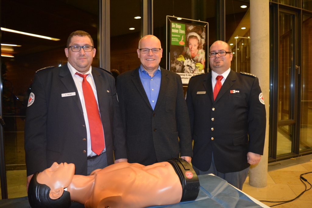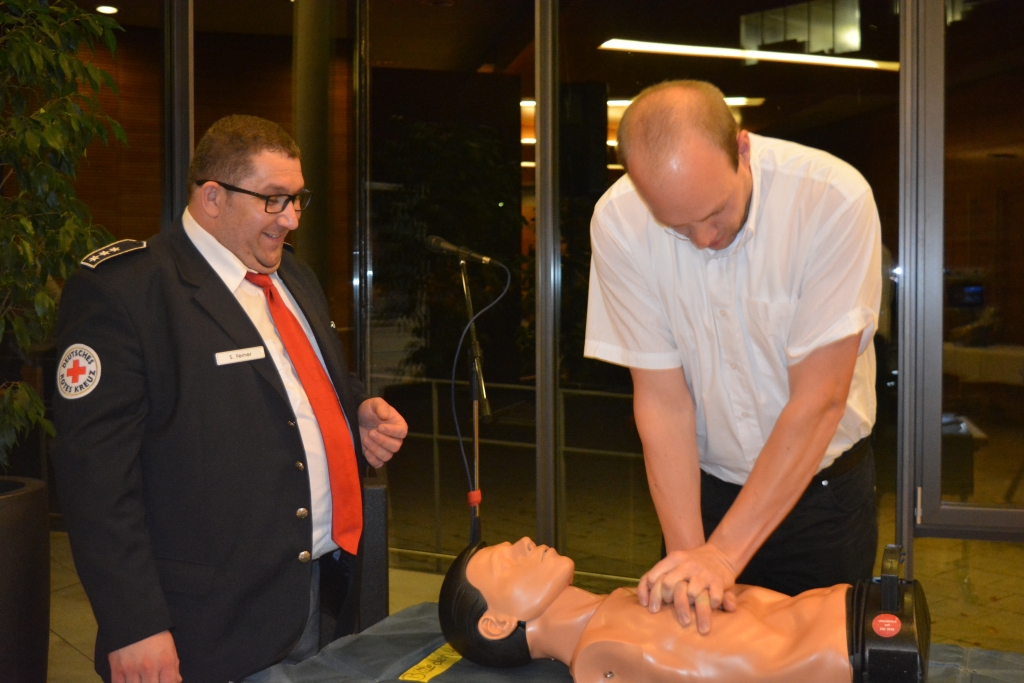 Im Anschluss an den offiziellen Ehrungsteil demonstrierte Rettungsassistent Sven Feiner, wie einfach eine Wiederbelebung bei einem Herzstillstand sein kann. 'Wichtiger als die Mund-zu-Mund-Beatmung ist, das Herz zu stimulieren', klärte Feiner auf und lud die Blutspender dazu ein, das fachgerechte Reanimieren an einer mitgebrachten Übungspuppe zu versuchen. Es gilt, den Brustkorb 100 Mal in der Minute zu drücken, um die Sauerstoffversorgung im Gehirn aufrechtzuerhalten. „Wenn dabei eine Rippe bricht, dürfen Sie sich nicht beirren lassen“, machte der Rettungsassistent Mut, um beherzt einzugreifen, wenn ein Mensch in Not gerät und ein Herzstillstand.