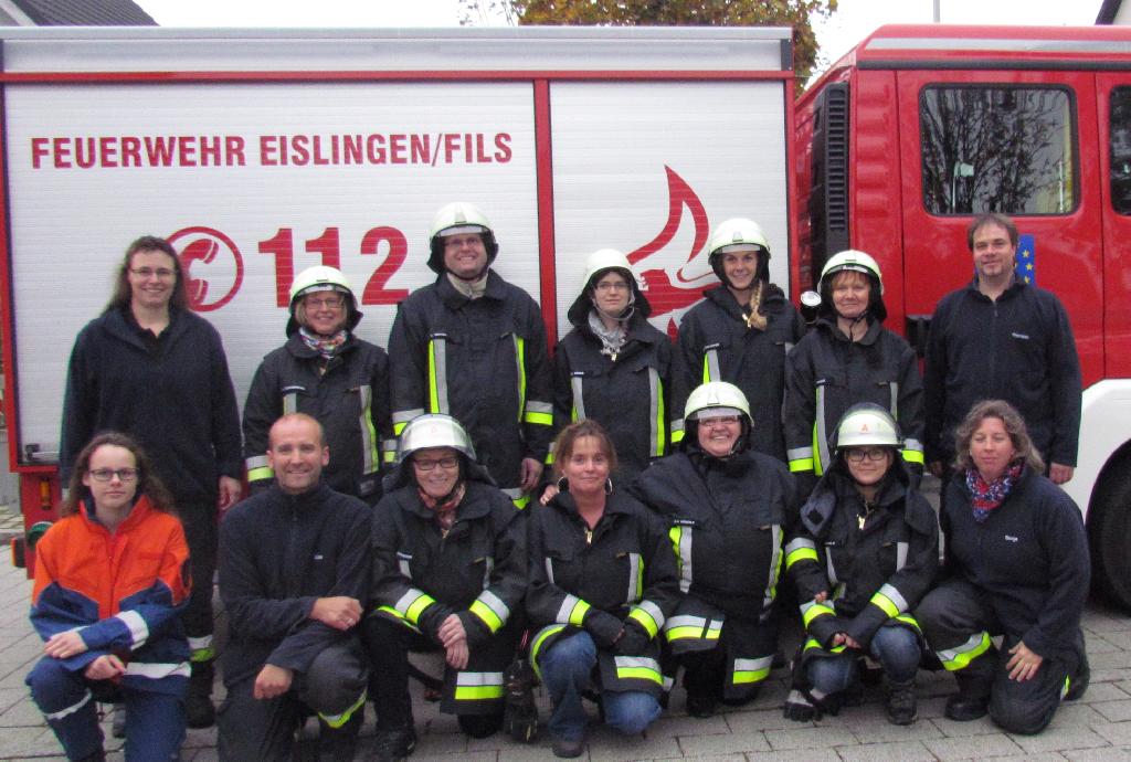 Der Begrüßung folgt ein halbstündiger Vortrag über die Organisation der Feuerwehr Eislingen und deren Aufgaben. Vor dem Beginn des praktischen Teils werden die Frauen mit Helm, Einsatzjacke und Handschuhen ausgestattet. Anschließend folgt die Erkundung des Löschfahrzeugs; alle Gerätschaften werden herausgenommen, erklärt und Fragen dazu gestellt. Einige Frauen trauen sich auch zu, das schwere Atemschutzgerät kurz auf den Rücken zu schnallen. „Ganz schön schwer!“, ist die einhellige Meinung. Nach einer kurzen Pause startet die Stationsausbildung. Es wird vermittelt, wie ein Standrohr gesetzt wird, wie Schläuche gefahrlos und sicher ausgerollt werden, wie man sich über Knoten sichern kann, wie der Verteiler funktioniert und wie das Strahlrohr bedient wird.