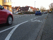 Hinweis: Da sich Rad- und Autofahrer die Fahrbahn teilen, zählt der Schutzstreifen in der Radverkehrsplanung als eine Führungsform des Mischverkehrs, die auf gemeinsamer Rücksichtsname beruht. Schutzstreifen sind in der Regel jeweils 1,50 m (mindestens 1,25 m) breit und werden durch eine gestrichelte Markierung mit regelmäßigen Radpiktogrammen umgesetzt. Vom Kraftverkehr darf dieser falls notwendig im Begegnungsfall überfahren werden. Der Schutz des Radfahrers ist dabei aber immer zu beachten und diesem ist im Zweifelsfall Vorrang zu gewähren. Parken ist auf Schutzstreifen verboten - Halten ist erlaubt. Jedoch gilt es auch hier, Rücksicht auf den Radverkehr zu nehmen, da sich gerade hier im Zusammenhang mit dem ruhenden Verkehr Unfälle ereignen.