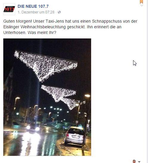Angefangen hat alles mit einem Bild, aufgenommen von Taxi-Jens, welches der Radiosender DIE NEUE 107,7 püntklich zum 1.Dezember um 7:00 Uhr morgens auf seiner Facebookseite veröffentlichte. Dieses Bild der traditionellen Eislinger Weihnachtsbeleuchtung machte im Netz die Runde und alle führenden Online-Agenturen, von Spiegel-online, TAZ, Fokus-Online, Bild-Online und viele mehr griffen dieses Thema auf.