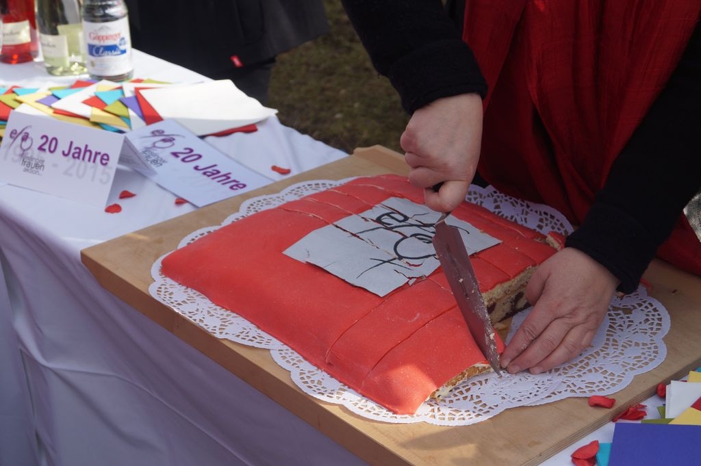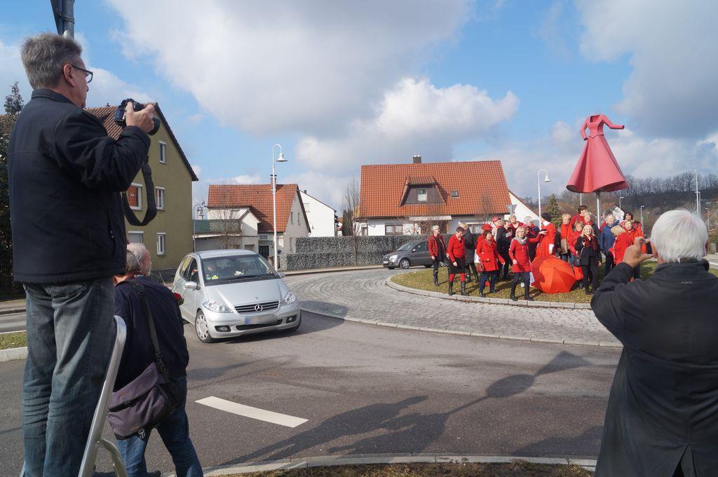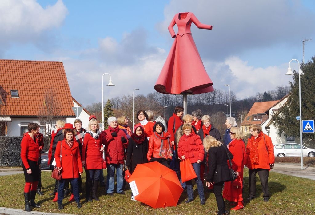 Mit einer Inszenierung bei Sekt und Torte am Kreisel 'Die Wegweiserin' hat efa - Eislinger Frauen Aktion- die Feierlichkeiten zum zwanzigjährigen Bestehen gestartet. efa- Frauen, mit rotem Kleidungsstücken oder Accessoires ausgestattet, fanden sich am Samstag bei strahlenden Frühlingswetter zum Gruppenbild unter dem Roten Kleid am Kreisverkehr in Eislingen ein. Extra zum Fototermin war auch die Schöpferin des Kunstwerks, Anja Luithle, angereist.