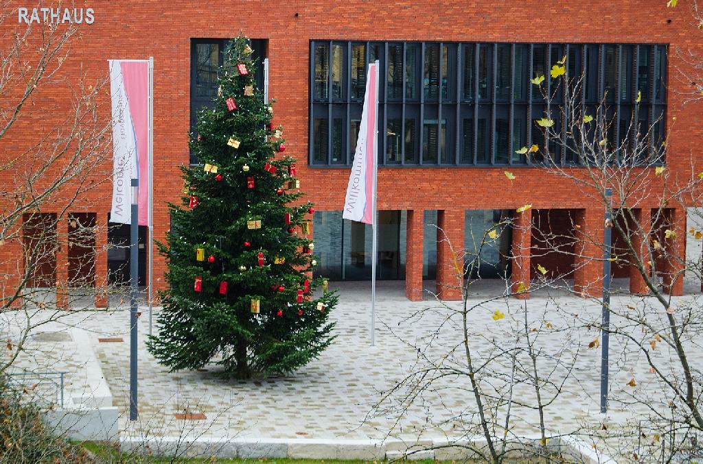 Mit dabei von Seiten der Stadtverwaltung waren Hauptamtsleiter Eberhard Weiler und die neue Koordinatorin für das Stadtmarketing Thea Heinzler, die den Baumschmuck anreichten.