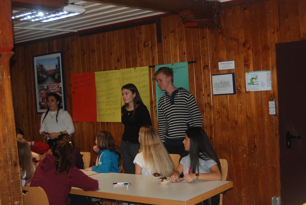 Am Mittwochnachmittag ging es los - mit mehreren Autos fuhren die Schüler zum Schwarzhornhaus in der Nähe von Waldstetten. Bis endlich alle Zimmer bezogen und die Betten gemacht waren gab es auch schon Abendessen. Danach wurden einige Kennenlernspiele gemacht, bei denen die Klassensprecher und die Lehrer sehr viel Spaß hatten. Am nächsten Morgen beteiligten sich alle hoch motiviert an der Jahresplanung für das Schuljahr 2016/17. Die Schüler konnten einerseits neue Aktionen, die die SMV organisieren soll, vorschlagen oder auch ihre Ideen einbringen, wie der Dr.-Engel-Realschule noch besser werden könnte. All diese Vorschläge und Wünsche präsentierten die drei Schülersprecher Fabian (10b), Elena und Vanessa (10d) am Donnerstagabend dem Rektor Herr Schlaiss und dem Konrektor Herr Dr. Önder. Sie erkundigten sich auch bei der Schulleitung über mögliche Erneuerungen oder Veränderungen am Schulgebäude und auf dem Schulgelände. Zum Abschluss des Tages machten die Klassensprecher eine spannende und sehr gruslige Nachtwanderung durch den dunklen und nebligen Wald rund ums Schwarzhornhaus. Wer danach nicht schlafen gehen wollte wurde von einer Aufsichtsperson mit einer Wasserspritzpistole nass gemacht.