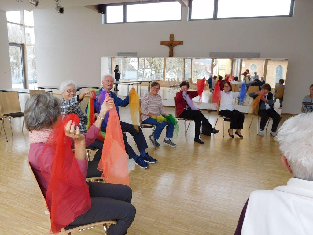 Um fit und aktiv zu bleiben, bedarf es keinen großen Aufwand, wie Anna Fink mit ihren Übungen mit Musik im Sitzen zeigte. Zu unterhaltsamen Liedern wurden mit Tüchern verschiede Tänze im Sitzen durchgeführt. Die erfahrene Leiterin stellte die Bewegungsabläufe vor, die von den Teilnehmern anschließend nachgemacht wurden. Die positiven Effekte zeigen sich dabei nicht nur in besserer körperlicher Verfassung, sondern sehr wohl auch in einer besseren geistigen Leistungsfähigkeit. Nach einer kurzen Erfrischungspause bei belegten Brötchen, Brezeln und Getränken, ging es mit dem Bewegungstreff von Alois Maier weiter.