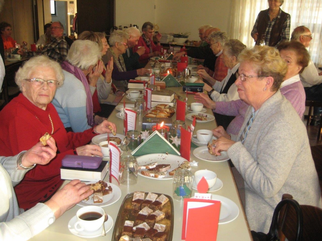 Pfarrer i.R. Ulrich Lauterbach begrüßte am Seniorennachmittag eine stattliche Anzahl Gäste im adventlich geschmückten Saal des Gemeindehauses. Das Eingangslied „Macht hoch die Tür“ wurde von Eberhard Staudenmayer am Klavier begleitet und Pfarrer Lauterbach sprach über Advent – Warten – Vorbereitung. 4 Wochen lang! Warten kann zur Vorfreude werden, z.B. auf lang ersehnten Besuch, den Tannenbaum, Geschenke und auf die Gewissheit der Ankunft Jesu. Davor jedoch muss alles angesammelte Gerümpel in uns weggeräumt werden, um seiner Liebe Platz zu machen. Wen haben wir vernachlässigt, wem nicht verzeihen können? Wünsche, Träume und Hoffen sind beim Gespräch in der Gemeinschaft bereichernd. Und: Gott sei Dank, er kommt bald!
