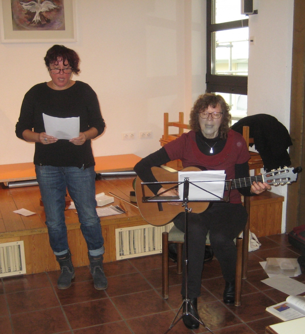 Mit Klavierbegleitung wurde „Tochter Zion“ gesungen, bevor die beiden Musikantinnen mit wechselnden Instrumenten und ihren Stimmen „Geh Hansel pack dei Bündel zam“, „Donna nobis Pacem“ und ein Hirtenlied aus den Bergen zu Gehör brachten. Nach dem gemeinsamen Lied “Wie soll ich dich empfangen“ hörten wir von U. Lauterbach eine kleine Weihnachts-geschichte, -„Die 25 und die Lilie“- in der sich eine ehemalige Mädchenklasse an ein einschneidendes Erlebnis vor dem 2. Weltkrieg erinnert. Es waren 25 Mädchen, die ihre Klassenlehrerin innig verehrten und sie nur „die Lilie“ nannten. Sie erkrankte und wurde ersetzt von einer Frau, die sich sehr mühte, aber bei den Schülerinnen keine Chance hatte. Bis sie erfuhren, welches harte Schicksal ihre neue Lehrerin mit dem Tod ihres Verlobten und der Pflegebedürftigkeit der Mutter zu tragen hatte. Da schämten sie sich abgrundtief. Als am letzten Schultag vor dem Weihnachtsfest Frl. Müller das Schulzimmer betrat, fand sie ihr Pult geschmückt mit 25 hübsch dekorierten Päckchen, und sie war zu Tränen gerührt. Das war ihr letztes Fest vor dem Krieg.