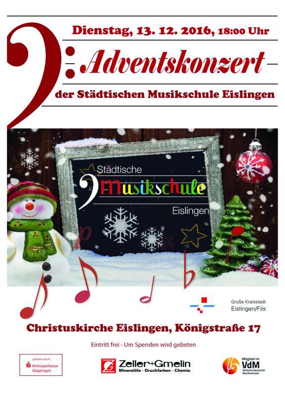 Eine gute Gelegenheit, die Städtische Musikschule kennen zu lernen, bietet sich beim Adventskonzert in der Christuskirche Eislingen (Königstraße 17) am Dienstag, 13.Dezember 2016 um 18:00 Uhr (Eintritt frei – um Spenden wird gebeten). Die Musikschülerinnen und –schüler entführen ihr Publikum in die musikalische Weihnachtswelt.