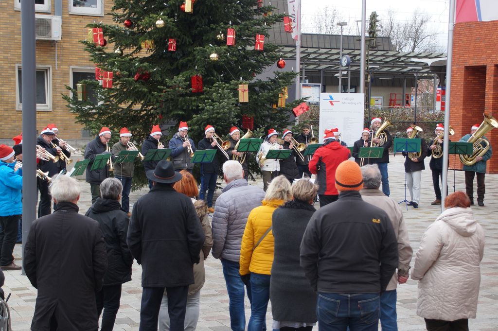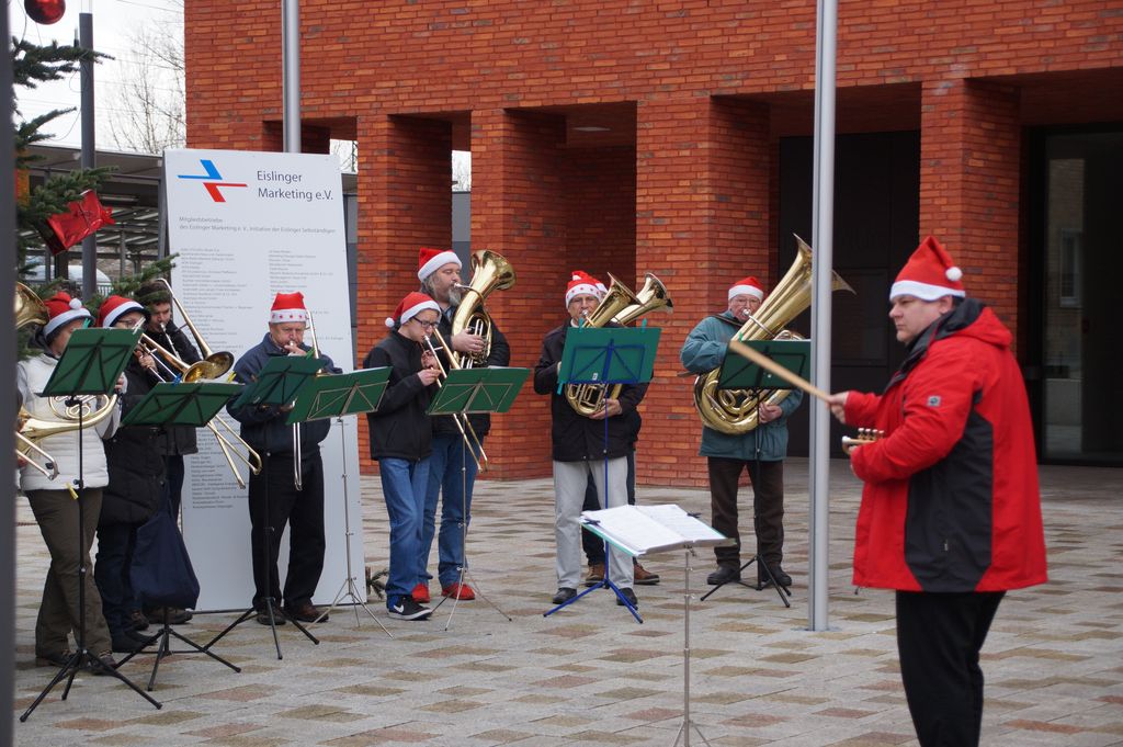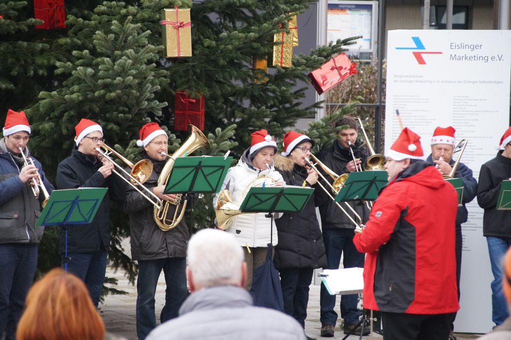 Zum ersten Mal wurde der Platz vor dem neuen Rathaus am Schloßplatz 1 von den 'Weihnachtsmusikanten' bespielt. Punkt 14 Uhr eröffnete der Musikverein Eislingen diesen neuen Spielort. Abgelöst wurde er ohne Unterbrechung vom Posaunenchor des evangelischen Jugendwerks. |
