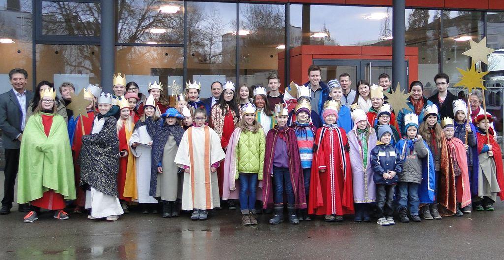 Die Sternsingergruppen mit ihren Betreuern, Pfarrer Bernhard Schmid und Oberbürgermeister Klaus Heininger