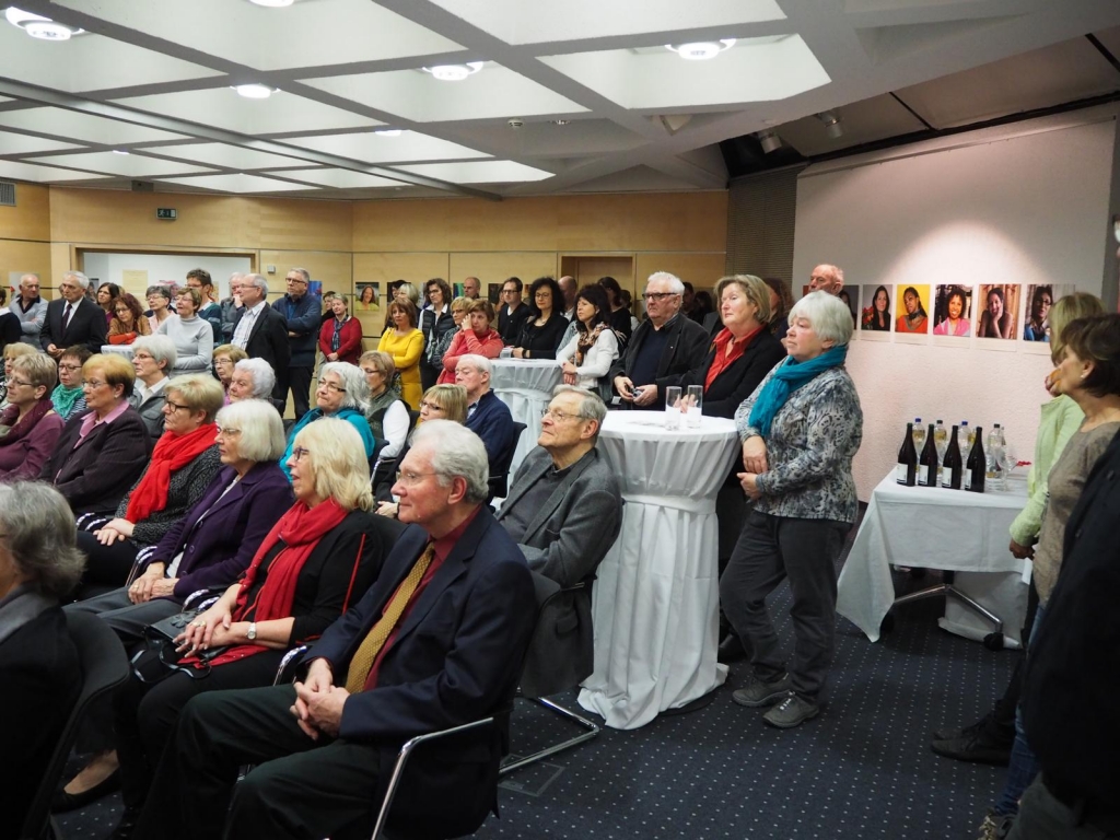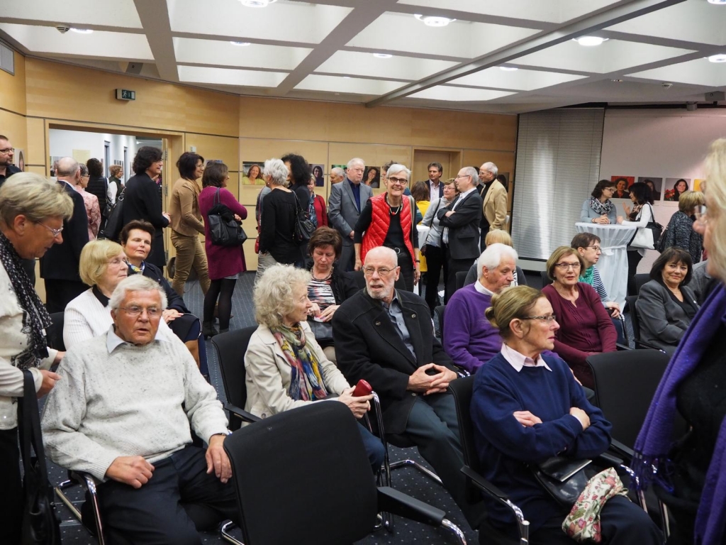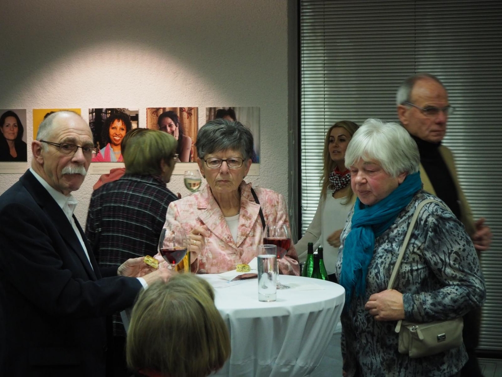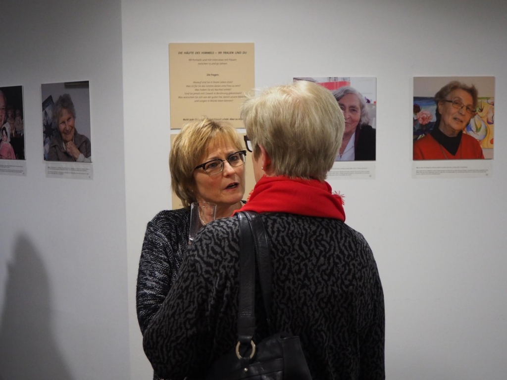 Die Vernissage zur Ausstellung „Die Hälfte des Himmels - 99 Frauen und Du“ in der Kreissparkasse Eislingen war mit über hundert Gästen ein voller Erfolg. Das rührende Kreissparkassenteam sorgte perfekt für das leibliche Wohl der Besucher und Besucherinnen. Der Kuratorin Annette Schiffmann gelang in ihrer beeindruckenden Eröffnungsrede, den Gästen das Thema der Ausstellung „Gewalt gegen Frauen“ auf bewegende Weise näher zu bringen.