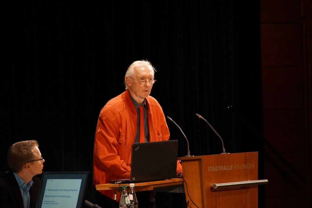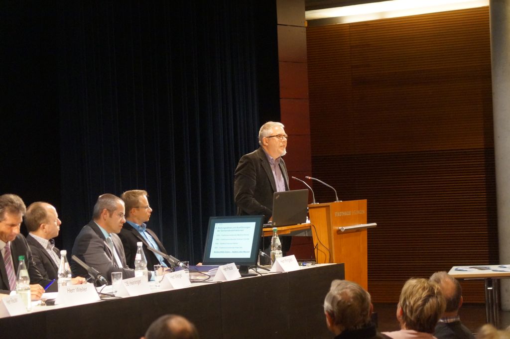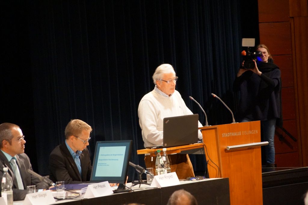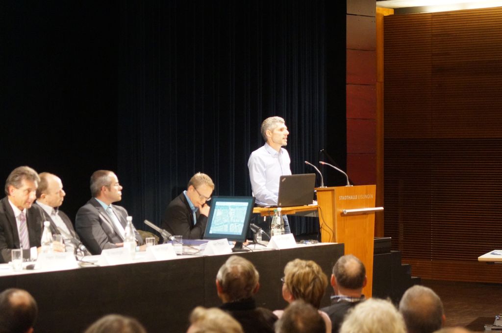 OB Klaus Heininger eröffnete die Informationsveranstaltung zu diesem Thema in einen mit fast 400 Personen gut gefüllten großen Saal der Stadthalle. Herr Heininger stellte bei seiner Eröffnung klar, dass er sich nach den Expertenanhörungen für den Umbau zu jetzigen Zeitpunkt im Rahmen des Sanierungskonzepts 'B10 neu' entschieden habe. Nach Experteninfos, die den interessierten Bürgerinnen und Bürgern bereits in Veranstaltungsreihen im letzten Jahr vorgestellt wurden - allerdings mit deutlich geringerem Interesse-, kamen die Vertrauenspersonen der Initiatoren des Bürgerentscheids, Herr Werner und Herr Rieck, zu Wort, die für eine Verschiebung der Baupläne um die Hirschkreuzung warben. Hier stellten Sie die Sicherheit für Radfahrer und Fußgänger beim Bau eines Kreisverkehrs in Frage. Herr Werner setzte sich kritisch mit den aufgezeigten Unfallzahlen in den Unterführungen und Kreisverkehren in Eislingen auseinander, er selbst verwies auf die Gesamtunfallzahlen im Straßenverkehr im Kreis Göppingen.