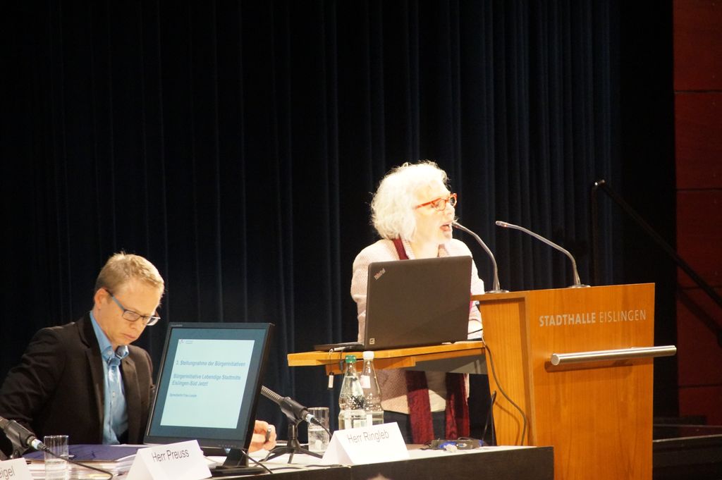 Für die Bürgerinitiative 'Lebendiges Eislingen Süd Jetzt' bezog Frau Leube in ihrer Stellungnahme den Wunsch nach einer Aufwertung der Hirschkreuzung und des Platzes vor der Lutherkirche zu einem innerstädtischen Lebensmittelpunkt. Besonders für Menschen mit Behinderungen sei die jetzige Unterführung keine sichere Entlastung, sondern erschwere die Überwindung der Kreuzung.