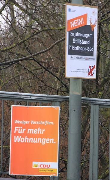 Zu betonen ist noch, dass wir von einer derartigen Plakatierung wie im beschriebenen Fall natürlich ohnehin absehen würden, da die Bestimmung wirklich sinnvoll ist, auf der Überführung keine Plakate in Form von Fahnengestaltung anzubringen, sondern ausschließlich direkt am Brückengeländer, denn die Plakate könnten auf die darunter liegenden Wege und Verkehrstrassen fallen. Die Plakate derer, die beim Bürgerentscheid für ein negatives Votum plädieren, sind überdies keine leichten Hohlkammerplakate, sondern aus Holz...