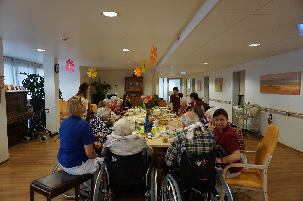 Das Küchenteam hatte viele leckere Sachen vorbereitet: Frische Brötchen, eine bunte Wurst- und Käseplatte sowie frischen Lachs, exotischen Fruchtsalat außerdem Müsli und leckere Marmeladen. In der Wohnküche brutzelten Rührei, Würstchen und Speck. Die Bewohner freuten sich über das besondere Frühstück und stießen mit Sekt-Orange an. Im Anschluss wurden noch ein paar fröhliche Lieder gesungen um das Frühstück stimmungsvoll ausklingen zu lassen. Bis alle Wohnbereiche dran waren, findet das Frühstück jeden Mittwoch statt. Die Bewohner freuen sich schon auf die nächste Runde des Schlemmerfrühstücks im Herbst.