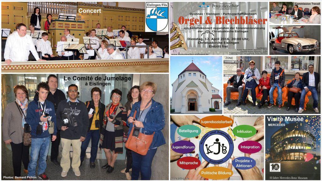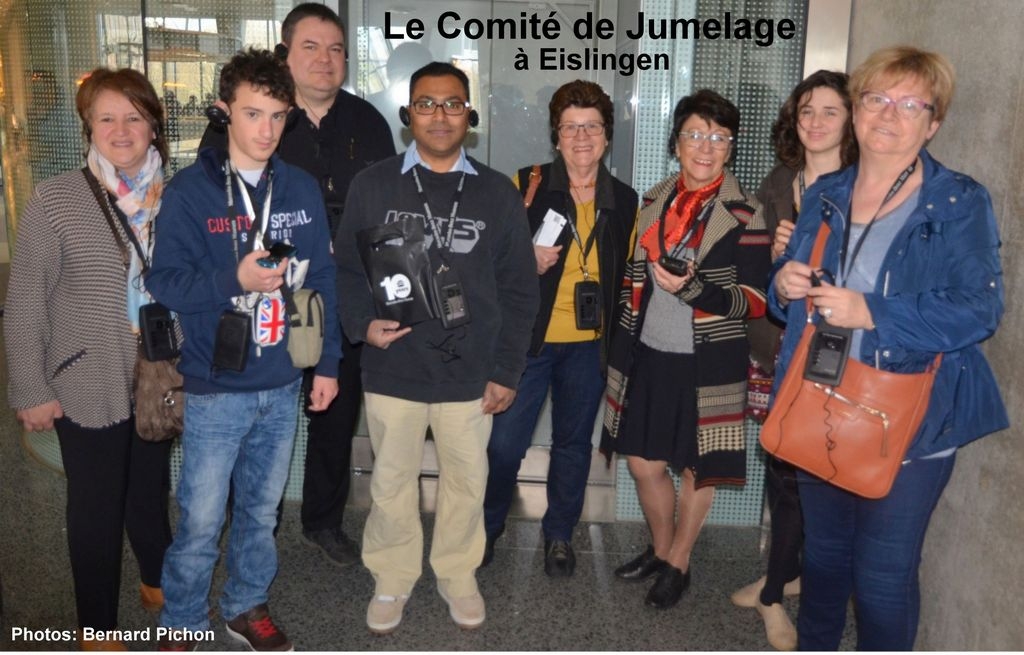 Uns erreichte von dem Fotografen Bernard Pichon aus unserer Partnerstadt Oyonnax eine nette Fotocollage vom Besuch einer kleinen Delegation Anfang April 2016 in Eislingen. Mit sachkundiger Unterstützung von Frau Karin Schuster vom Partnerschaftskomitee konnten wir die zugehörigen Bildinhalte 'entziffern'.