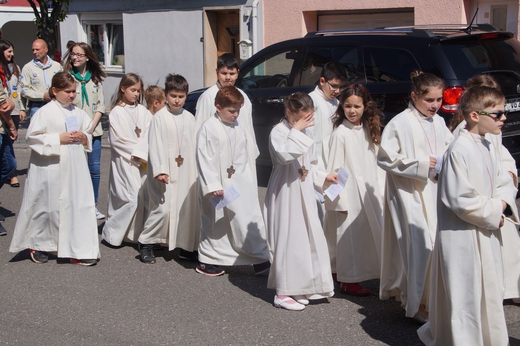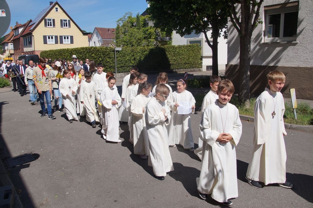 Der „Leib Christi“ getragen durch die Straßen _Eislingens. Am höchsten Feiertag der Katholiken war der Zuspruch der Gläubigen beim Fronleichnamsumzug gut. Bei sonnigen Vorsommerwetter nutzten viele Katholiken den hohen Feiertag zum Glaubensbekenntnis.