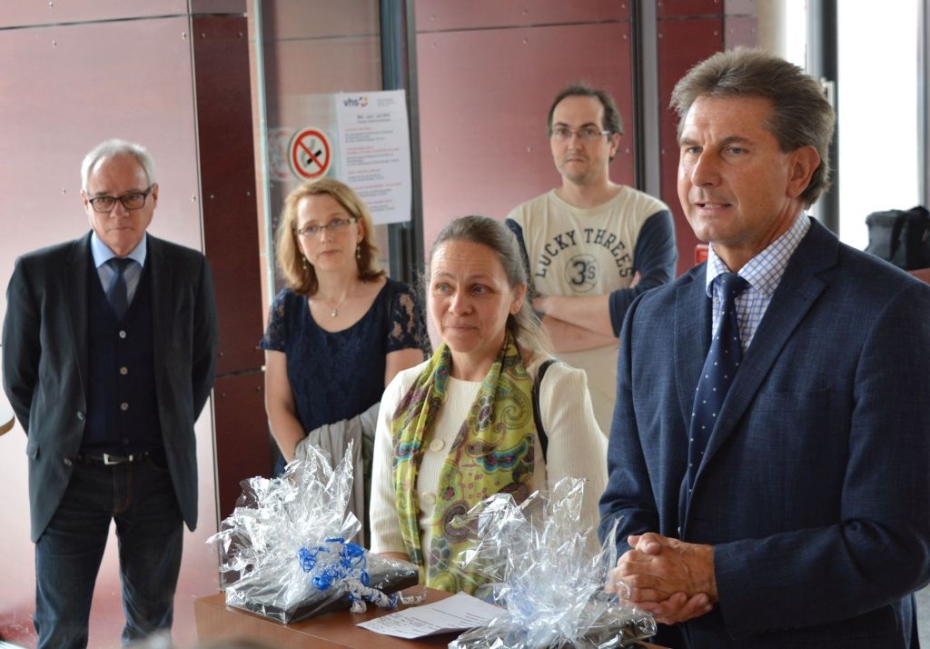 Großes Lob gab es zum Abschluss für beide Schulen und ihre Schüler, die Motor dieser Partnerschaft seien und dazu beitragen, dass beide Städte immer weiter zusammenwachsen. „Ich bin sehr stolz darauf, dass unsere Schulen diese Partnerschaft richtig leben“, sagte das Stadtoberhaupt an die Adresse des Schulleiters Michael von Hagen. Für den Rektor des EKG war es der letzte Schüleraustausch, den er begleitete, bevor er mit Ablauf des Schuljahres in den Ruhestand geht. Als Anerkennung für ihr Engagement über den Schulalltag hinaus hatte OB Heininger für die betreuenden Lehrer ein kleines Präsent parat. Zur Korrektur von Klassenarbeiten gab es für die Lehrer schöne Schreibutensilien und die Schüler erhielten als Erinnerung praktische Schulterbags, die gleich zum Einsatz kamen.