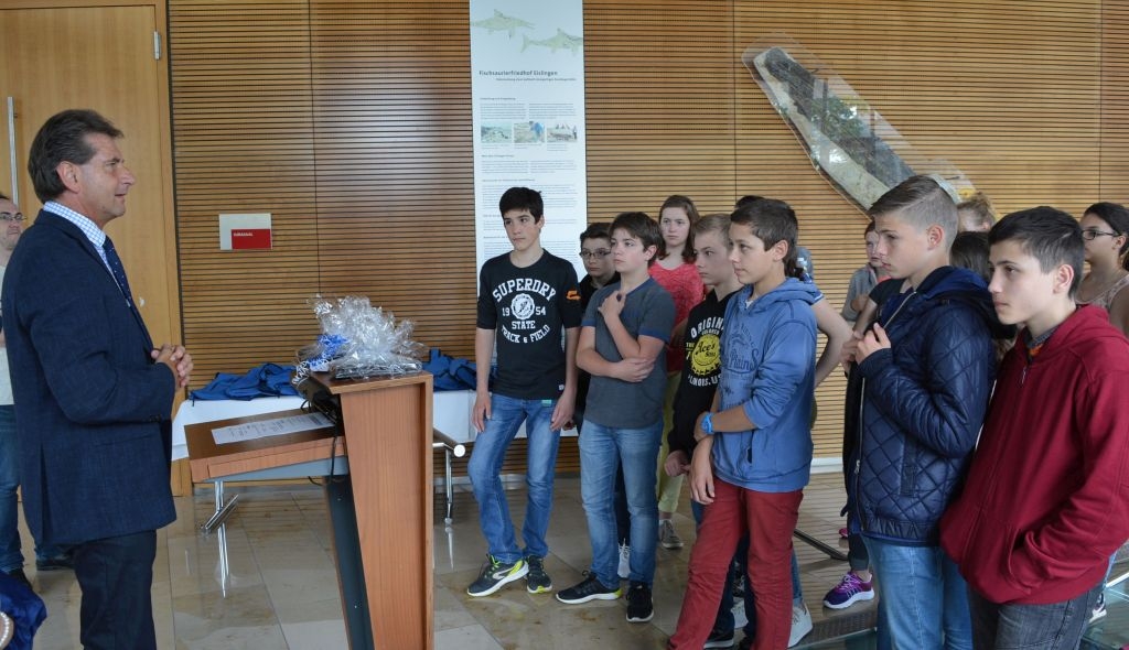 „ Leider hat das heute nicht geklappt“, bedauerte OB Klaus Heininger. Ausgerechnet an diesem Tag wurde der letzte Technikcheck im neuen Ratssaal vorgenommen. Die Schüler nahmen es gelassen, bildeten doch die fossilen Ausstellungsstücke des Fischsauriers in der Stadthalle eine interessante Kulisse, zu der OB Heininger Interessantes erzählen konnte.