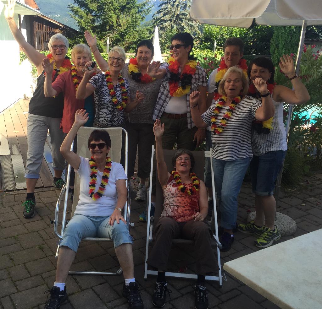 Die Wanderung durch die mit rosaroten und rostroten Alpenrosenblüten bedeckten Berghänge war ein einmaliges Erlebnis. Am zweiten Tag fuhren wir ins Etschtal nach Dorf Tirol. Hoch über Meran auf einem mächtigen Schlosshügel thront das Schloss Tirol, welches wir auf einem bequemen Spazierweg erreichen konnten. Ein paar Kilometer weiter geradeaus durch den Wald kamen wir zu der Jausenstation Weißgütl. Mit einem spritzigen Weißwein aus eigenem Anbau, Südtiroler Speck und Käse ließen wir es uns richtig gut gehen. Ein toller Abschluss des Tages war dann natürlich das Fußballspiel, das uns alle an den Rand des Zusammenbruchs brachte. Am dritten Tag fuhren wir mit dem Bus auf Europas größte Hochalm, die Seiser Alm. Die Rundwanderung auf dem Puflatsch mit seinen 2.174 Höhenmetern sowie eine Einkehr in der Arnika-Hütte können wir jedem nur empfehlen. Selbst die Rückreise am vierten Tag über die als „Perle Tirols“ bekannte Stadt Kufstein war richtig nett. Dass wir Sportlerinnen auch singen können haben wir mit dem mehrstimmigen Vortragen des Kufstein-Liedes bewiesen.