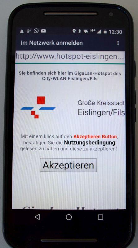 Bei dem einfach gehaltenen Einwählvorgang in das WLAN-Netz mit dem Namen „City-WLAN Eislingen/Fils“ wird der Nutzer aufgefordert, die Nutzungsbedingungen zu akzeptieren. Der Zugang wird nach wenigen Sekunden frei geschaltet.