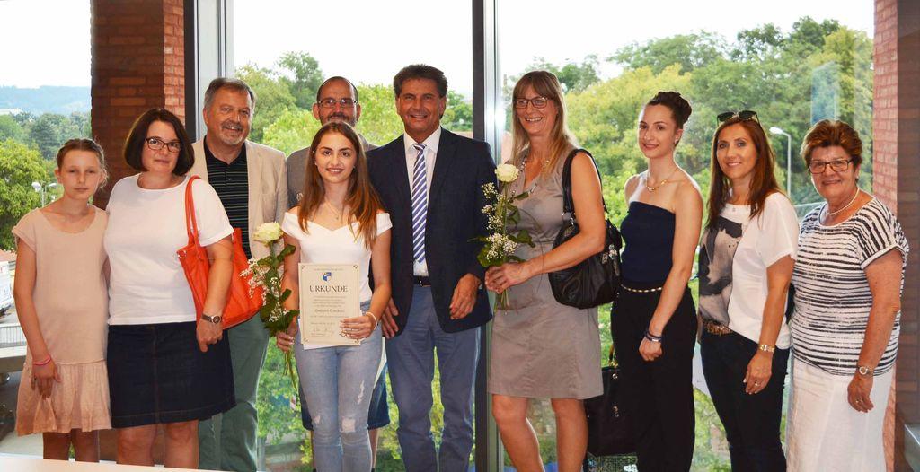 V.l.n.r. Stefanie Doosry (EKG) mit Tochter, Partnerschaftsbeauftragter Eberhard Weiler, Gotthard Valier, Debora Cardaci (Preisträgerin), OB Klaus Heininger, Ulla Valier, Katja Cardaci, Despina Hahn (Dr.-Engel-Realschule), Karin Schuster (Vorsitzende Partnerschaftskomitee)