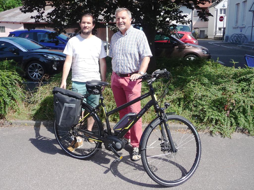 Übergabe des neuen Dienstpedelecs vom Haupt- und Personalamtsleiter Eberhard Weiler an den Radverkehrsbeauftragten Tobias Schwämmle vom Planungsamt