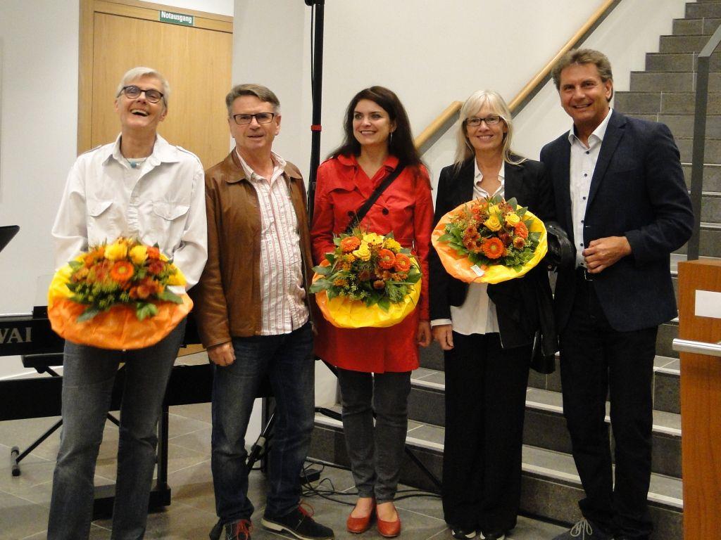 Künstlerinnen und Initiatoren (v.l.n.r. Tina Stroheker, Paul Kottmann, Manuela Tirler, Brigitte Schwacke) mit Oberbürgermeister Klaus Heininger (re.)