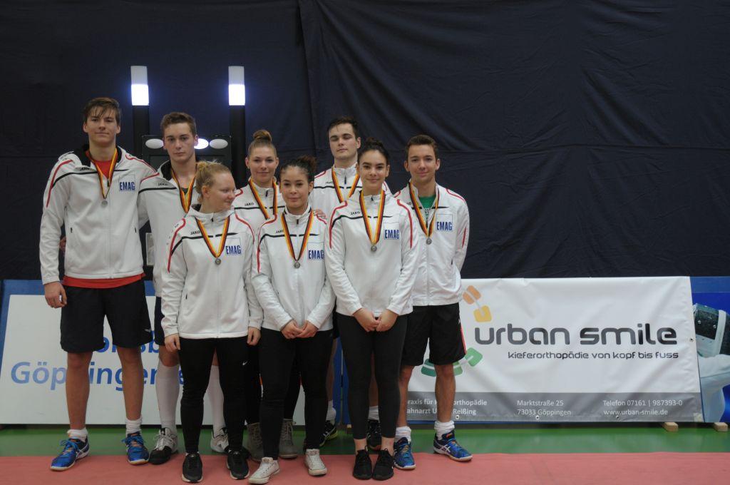 In den Mannschaftswettbewerben konnten beide Mannschaften die Silbermedaille erringen. Die Damen konnten im Halbfinale Dormagen deutlich distanzieren. Im Finale standen sie dann den Favoritinnen aus Künzelsau gegenüber. Trotz starker Leistung mussten die Mädels Künzelsau den Vortritt lassen. Die Silbermedaille ist ein Topergebnis. Auch die Jungs zeigten starke Gefechte. Sie mussten sich im Finale nur Dormagen geschlagen geben. Mit diesen tollen Ergebnissen zeigten unsere Fechterinnen und Fechter wieder, dass sie in Deutschland absolute Spitze sind.