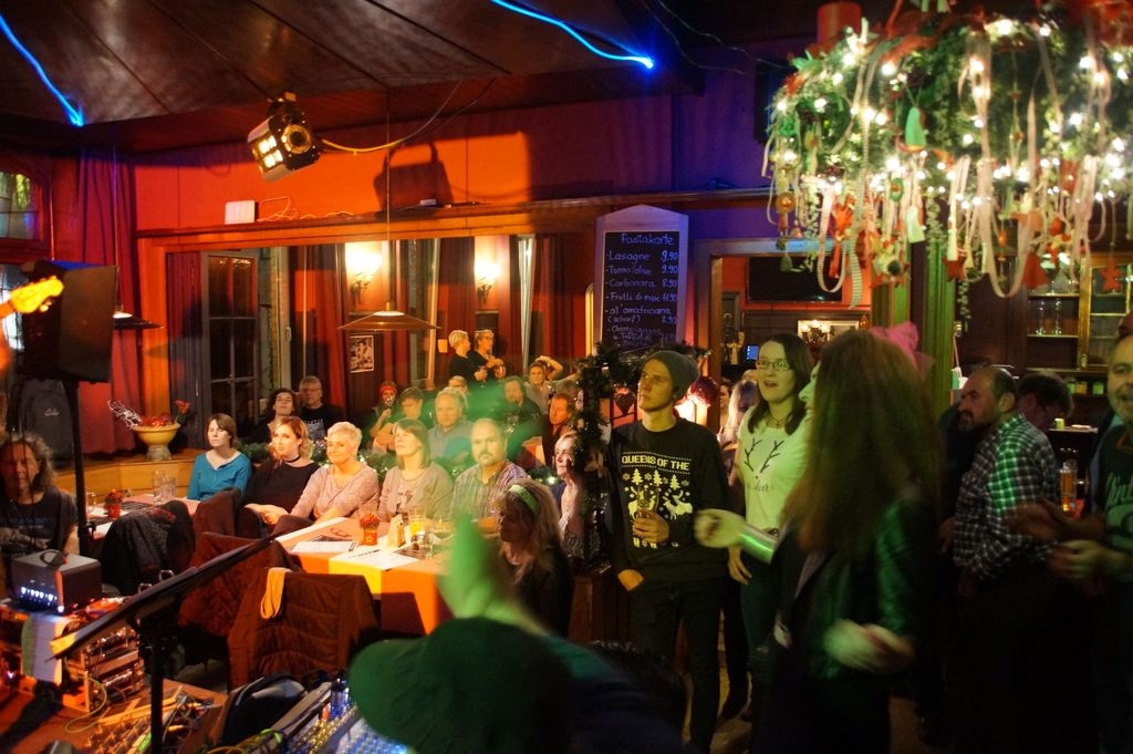 Hierfür müssen für die Bretter, die für den Künstler die Welt bedeuten, einige Wirtshaustische weichen, damit die Veranstaltungsbühne hinter der Zentralen Säule aufgebaut werden kann.
