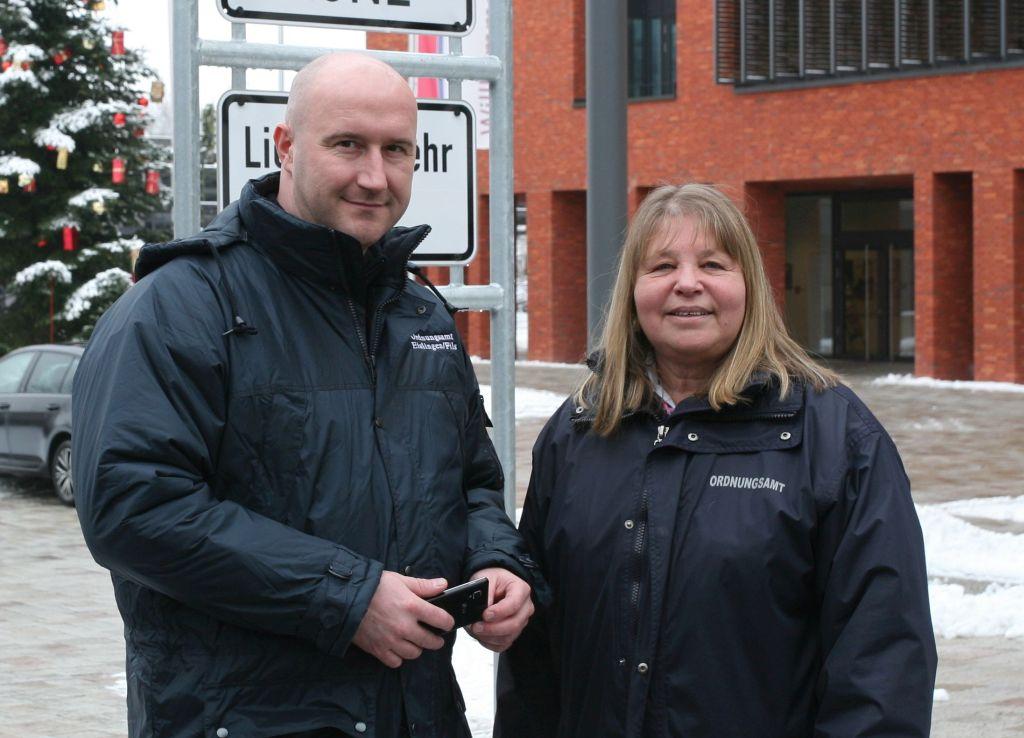 Seit 1. Januar gehört Rico Teimann zum Team der städtischen Verkehrsbehörde und sorgt mit seinen Kolleginnen dafür, dass in Eislingen entsprechend der Straßenverkehrsordnung geparkt und gefahren wird. Er kontrolliert außerdem, ob Gefahrenstellen korrekt beschildert sind und ob vom Bürger- und Ordnungsamt angeordnete Maßnahmen richtig und fristgerecht durchgeführt werden. Rico Teimann löst Ursula Höfler ab, die nach über 20 Jahren bei der Stadtverwaltung in den verdienten Ruhestand geht. Rico Teimann (li.) löst Ursula Höfler (re.) ab, die Ende Januar in den Ruhestand tritt |