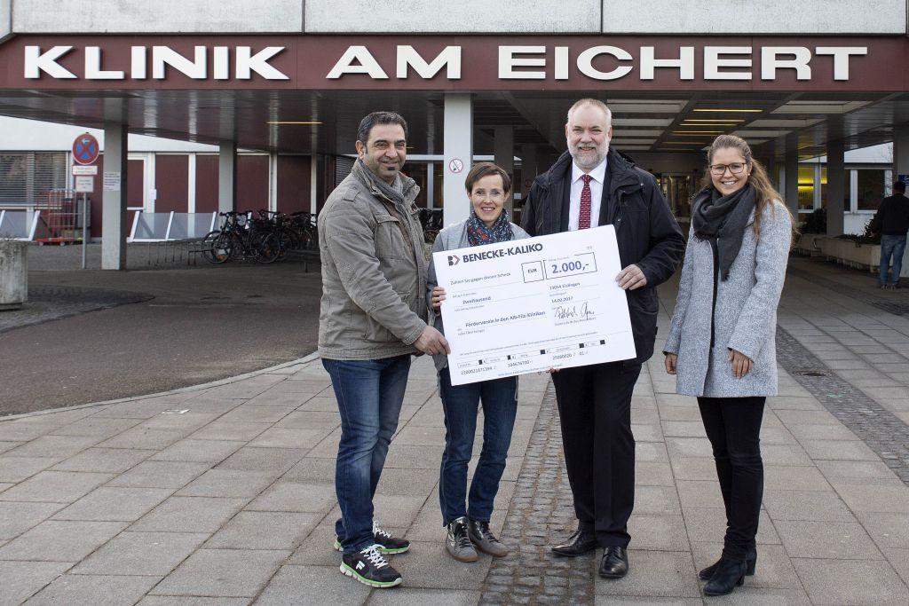 Der Eislinger Oberflächenhersteller Benecke-Kaliko unterstützt den Förderverein der Alb Fils Kliniken erneut mit 2.000 Euro. Der Betrag stammt größtenteils aus dem Erlös jährlichen Weihnachtsfeier. Die Mitarbeiter kauften eifrig Tombolalose für den guten Zweck und finanzierten die Spende über den Kauf von Getränken mit. Die Summe wurde dann noch vom Unternehmen aufgestockt.