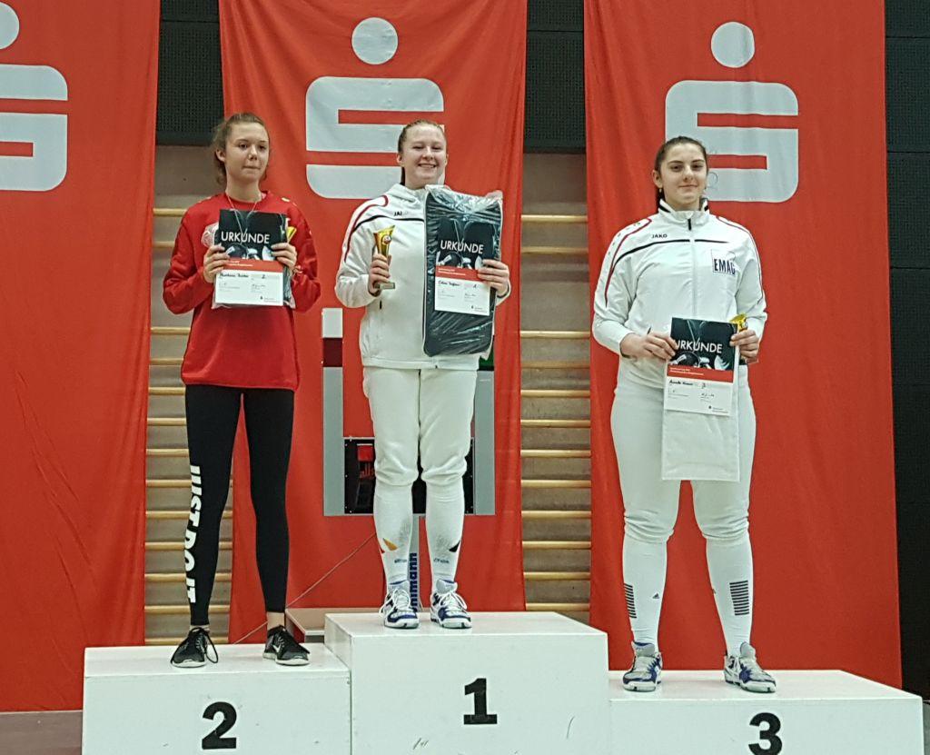 In der A-Jugend der Mädels konnte Celina Treffkorn den ersten Platz erreichen. Ohne große Probleme erreichte sie das Finale und schlug hier Madeleine Becker vom Gastgeber Künzelsau 15:13. In dieser Altersklasse gab es noch eine weitere Medaille für Annette Kramer, sie wurde Dritte. Wie Celina erreichte sie die Runde der letzten 4 mit starken Gefechten. Im Halbfinale musste sie sich dann allerdings knapp Becker geschlagen geben. Hinter Annette landete Lea Hartmann auf Platz 7. Auch sie musste sich Becker knapp unterordnen. Die restlichen Eislinger Mädels Violetta Kramer, Inga von Buch und Finja Schmid belegten die Plätze 12, 19 und 21.