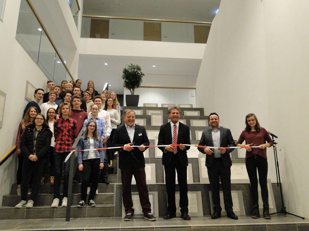 Manch einer wunderte sich im vergangenen Herbst über Schülerinnen und Schüler, die mit Zeichenblock und Bleistift, das Treppenhaus des Rathauses bevölkerten. Die Ergebnisse, flutpunktperspektivischen Zeichnungen, können nun im Rathaus bestaunt werden. Das Rathaus als Objekt für künstlerische und räumliche Zeichnungen, „das wünscht man sich, wenn ein solches Projekt nach Jahren der Mühe umgesetzt werden konnte“, freute sich Oberbürgermeister Klaus Heininger bei der Eröffnung. Schulleiter Stephan Arnold zeigte sich stolz über die Arbeit der Schülerinnen und Schüler des Erich Kästner Gymnasiums und lud alle Interessierten ein, die Arbeiten und die Architektur des Hauses auf sich wirken zu lassen.