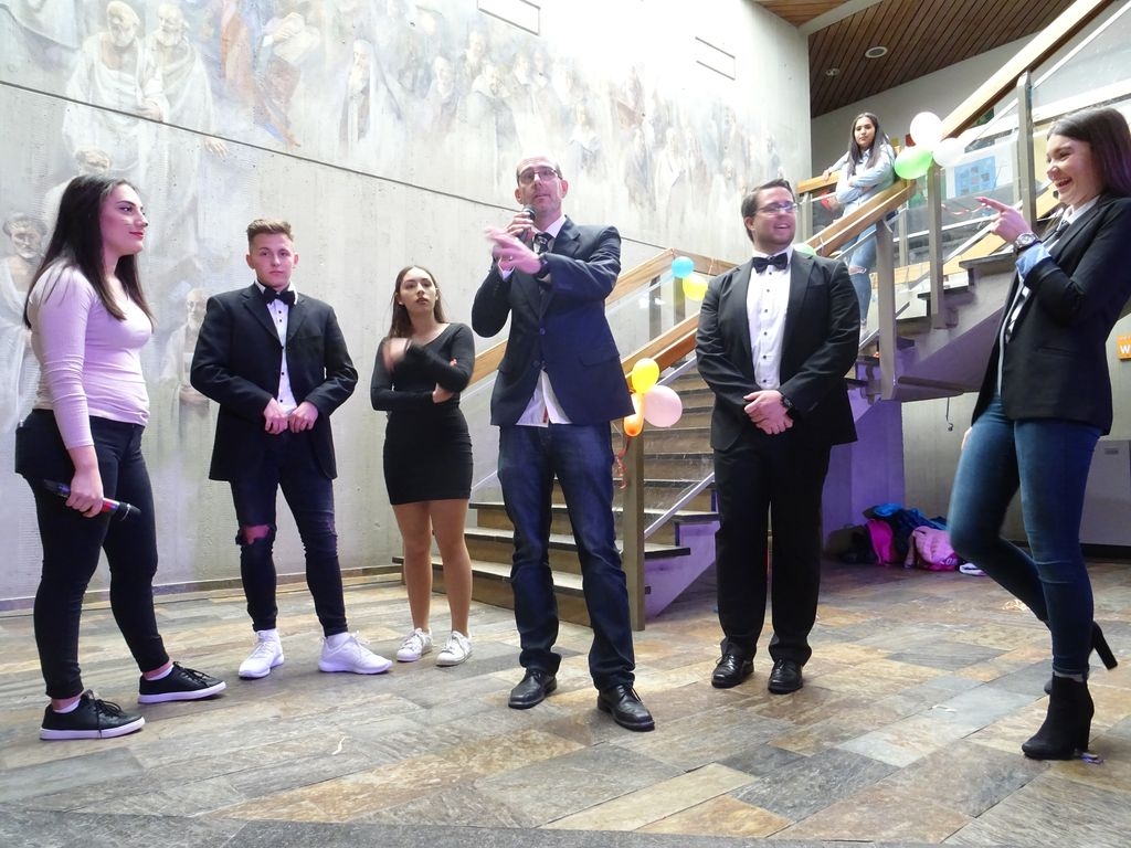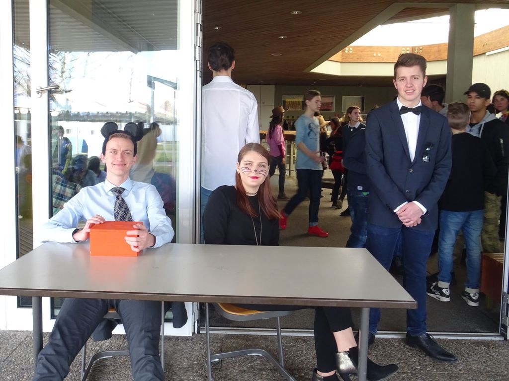Am 23. Februar war eine ganze Menge los an unserer Schule. Am Vormittag ging es glamourös zur Sache, denn das Motto lautete „Herr Schlaiss bzw. glamour day“. Aber was hat Herr Schlaiss nun mit Glamour zu tun? Ganz einfach, wir kennen unseren Schulleiter gar nicht anders als im Anzug. Um uns also mal anzugleichen rief die SMV zu diesem Tag auf und alle, die Lust hatten, mitzumachen, sollten sich edel kleiden und mal nicht „nur“ in Jeans und Shirt in die Schule kommen. Sehr viele Schüler und Lehrer haben hierbei mitgemacht. Natürlich gab es auch einen Preis für das schönste Outfit. Unter den Schülern haben Marcel Müller und Joelle Malathoniadis, beide in den Klassen 9, gewonnen. Herr Nowak konnte mit einem Smoking überzeugen und gewann als Lehrer. An dieser Stelle nochmals herzlichen Glückwunsch an die Gewinner und ein Dankeschön an alle, die mitgemacht haben. |