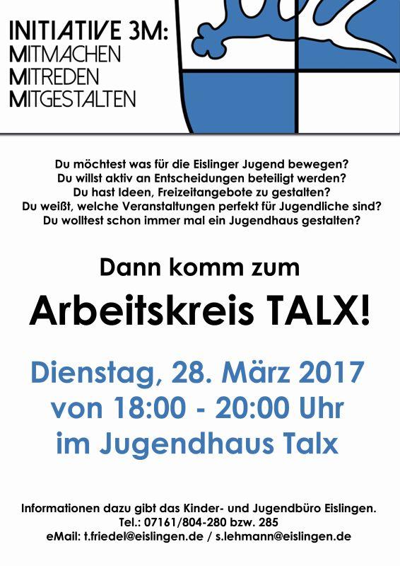 Dort heißt es in der Einleitung, „Die Gemeinde soll Kinder und muss Jugendliche bei Planungen und Vorhaben, die ihre Interessen berühren, in angemessener Weise beteiligen. Dafür sind von der Gemeinde geeignete Beteiligungsverfahren zu entwickeln. Insbesondere kann die Gemeinde einen Jugendgemeinderat oder eine andere Jugendvertretung einrichten“. Susanne Lehmann, ebenfalls Sozialpädagogin im Kinder- und Jugendbüro, erklärt dazu, dass man in Eislingen das Jugendforum als Beteiligungsverfahren installiert hat. „Die Initiative 3M ist Bestandteil des Jugendforums, aber in sehr konkreter und zielorientierter Weise. Hierbei geht es um die Neuausrichtung des Jugendhauses Talx am Schlosspark.“ Jahrelang vom Talx e.V. verwaltet, soll es nun, nachdem der Verein seine Auflösung bekanntgegeben hat, umstrukturiert und neu konzipiert werden. „Wir wollen Jugendlichen die Möglichkeit geben, ihr Jugendhaus selbst zu gestalten und neue Freizeitangebote für Kinder und Jugendliche zu organisieren und durchzuführen“, beschreibt Friedel das Ziel der Initiative. Mit dem Projekt sollen vor allem Jugendliche angesprochen werden, die bisher die Angebote der Jugendhäuser Nonstop und Talx weniger bis gar nicht genutzt haben. Der Kern der Umsetzung bildet ein Arbeitskreis.