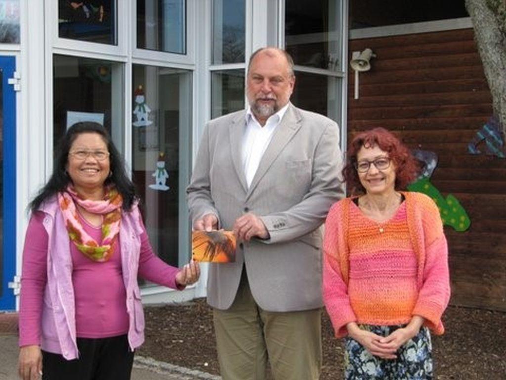 Nora Hummel (li.) und Heide Kottmann (re.) über- geben die Spende an Wolfgang Beyer (Schulleiter Pestalozzischule)