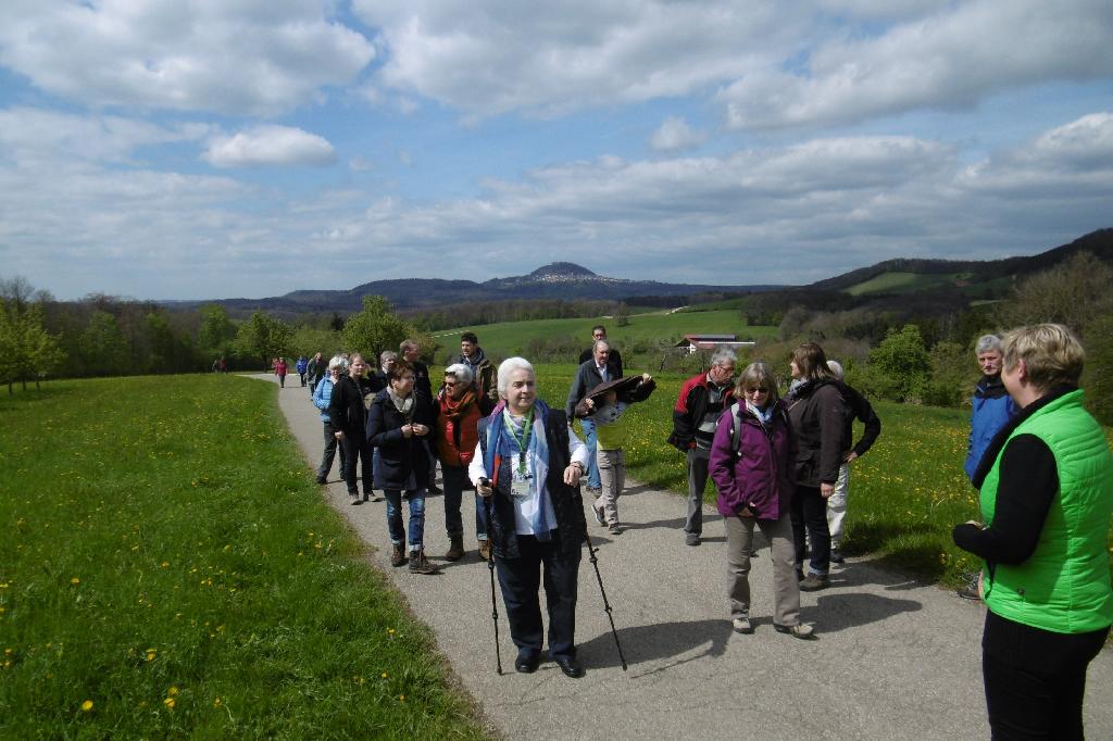 Am Sonntag, 23.04.2017 wurde der Treffpunkt auf 13:30 Uhr, wie gewohnt am Dorfgemeinschaftshaus Krummwälden, festgelegt. Es kamen 35 Interessierte, um bei leicht wechselnden aber doch trockenen Wetterbedienungen Richtung Kleingartenanlagen unterhalb der Gärtnerei Klingler zu marschieren. Startschuss für die Wanderung war standesgemäß ein „Startpilot“, eingeschenkt vom 1. Vorstand des Vereins Uwe Seiz. Munter und hoch motiviert trafen die Wandersleut gegen 14 Uhr bei den Kleingartenanlagen ein und wurden von Frau Dr. Weber, Biologin aus Salach, erwartet. Nach einer kurzen Vorstellung ihrer Person ging es weiter in Richtung Kapfhof. Bei mehreren Stopps erfuhren die Teilnehmer vieles über den Ursprung der Streuobstwiesen. So wurden einst Streuobstbäume wie ein Gürtel um ein Dorf gepflanzt, um eine Grundversorgung an Obst für die Bevölkerung sicherzustellen. Es gab viel Geschichtliches wie auch Aktuelles zum Thema Baumwiesen zu hören, so war zum Beispiel rege Diskussionsgrundlage das Thema Pflege von Obstbäumen. Es lohnt sich momentan kaum der Zeitinvest für Schnitt und Ernte der Erzeugnisse bei Preisen um die 7 € bis 12 € für den Doppelzentner (100 kg!) konventioneller Äpfel (Mostobst) bei der Annahmestelle.