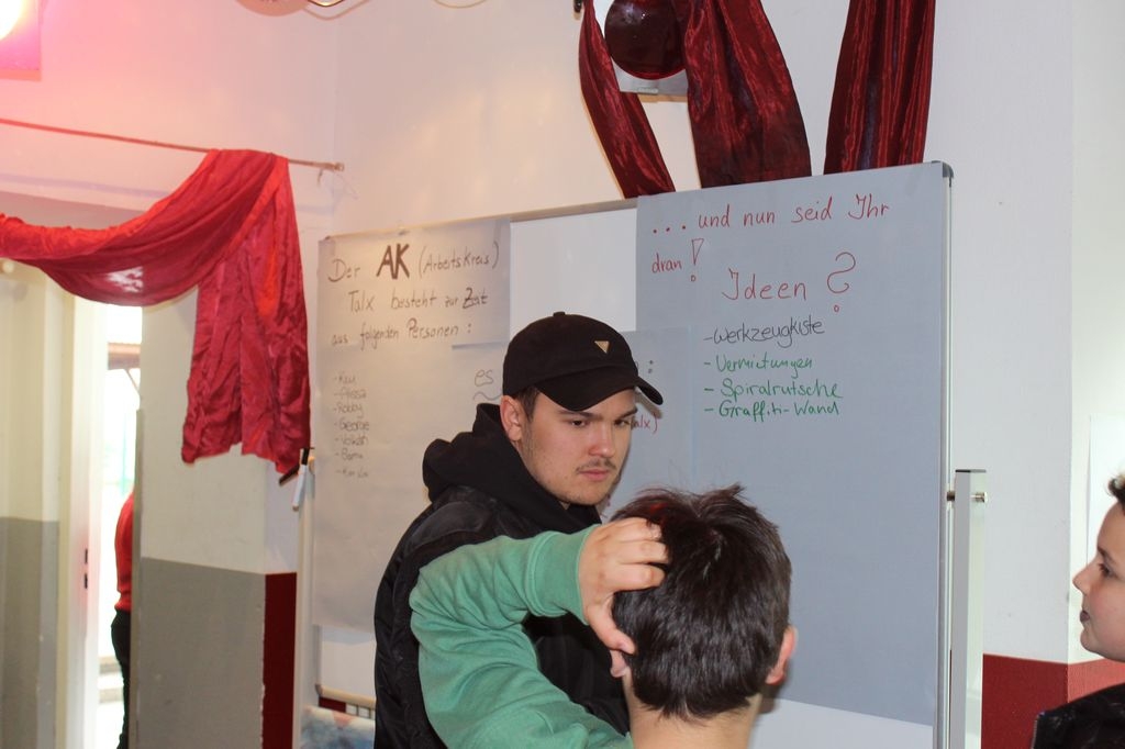 Die anfänglichen Bedenken, wer sich denn in welcher Form beteiligen könnte, waren schnell vom Tisch, denn nach und nach kamen rund 50 Jugendliche und junge Erwachsene aus ganz unterschiedlichen Gruppen im Talx zusammen. Auf den zwei Ebenen des Gebäudes gab es die Möglichkeit zu coolen Rhythmen zu tanzen, sich bei einem alkoholfreien Cocktail kennen zu lernen und über die Neugestaltung des Jugendhauses ins Gespräch zu kommen. „Super, dass dies hier möglich ist, denn wir haben kaum Orte, unsere musikalischen Interessen gemeinsam auszuleben und uns auszutauschen“, meinte ein Besucher begeistert. Unterstützt wurde dieser Prozess vom Arbeitskreis Talx, der aus einigen festen jugendlichen Teilnehmern besteht. Sie haben sich schon viele Gedanken gemacht und möchten nun ihre Ideen möglichst bald in die Tat umsetzen. Unterstützung erhielten sie an diesem Abend von allen Teilnehmern, die weitere kreative Vorschläge auf Plakaten festgehalten haben. Diese werden in den nächsten Arbeitskreisen bearbeitet. Eine Idee konnte sogar direkt aufgegriffen werden: auf den Stufen zum zweiten Stock wurden Wünsche für eine mögliche Umbenennung des Jugendhauses angebracht. „Ich finde es toll, dass hier so viele unterschiedliche junge Menschen so viel Eigenmotivation entwickeln und ihre Ideen einbringen“, meint Hänsi Weiss, Jugendhausleiter im Nonstop. Susanne Lehmann vom Kinder- und Jugendbüro ergänzt: „Tobias Friedel, mein Kollege, der heute leider nicht dabei sein kann, wäre begeistert von dem großen Interesse der unterschiedlichsten Jugendgruppen, die an diesem Abend gemeinsam an einem Ziel mitgearbeitet haben.“ Nun heißt es, dran bleiben und in Bewegung kommen.