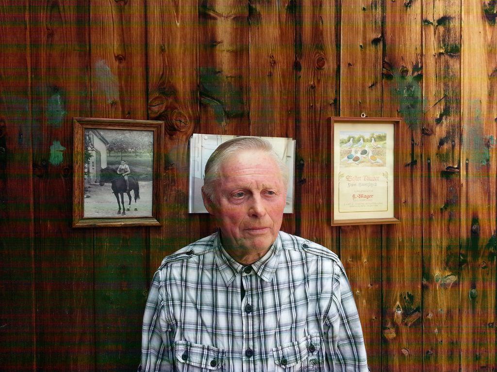 Getreu seinem Wunsch noch einmal in der Zeitung zu kommen, warf er sich in Schale und stellte sich für ein Porträtbild vor sein Scheunentor mit dem reitenden Bub und Jungzüchter Hans Mayer aus dem Jahre 1955.