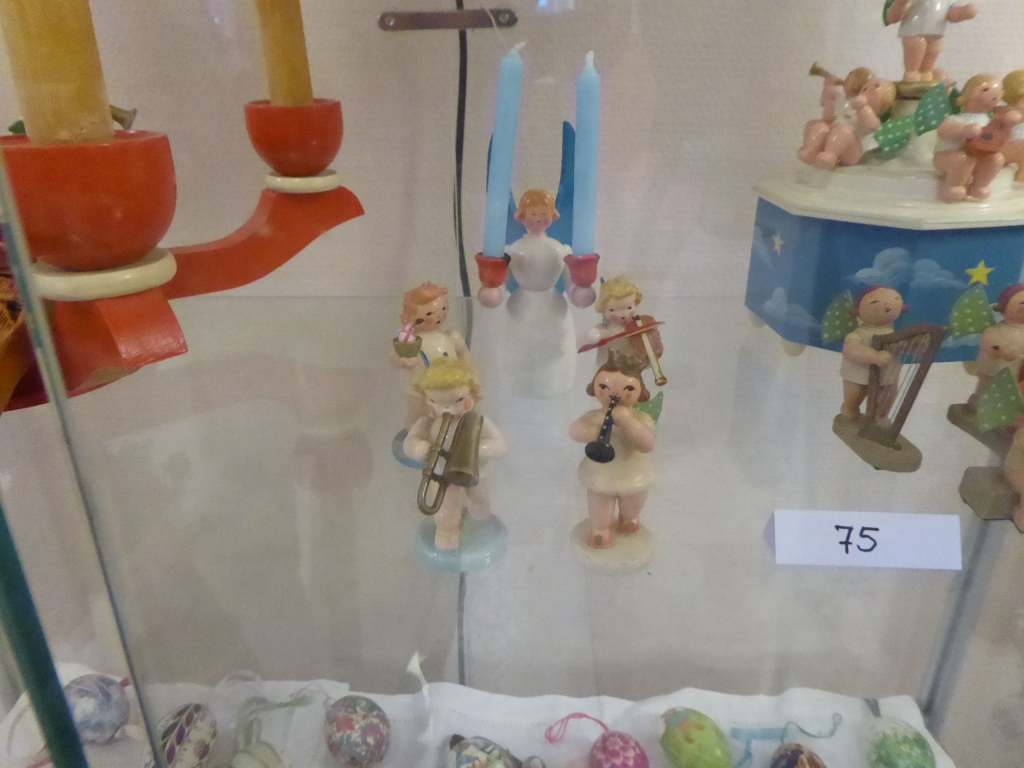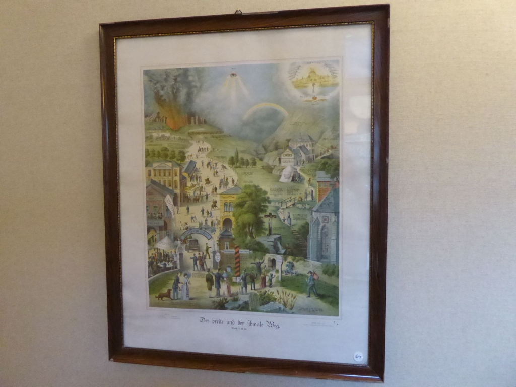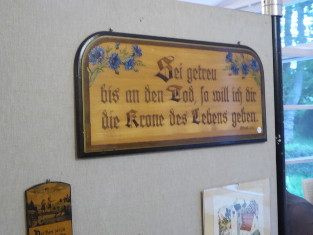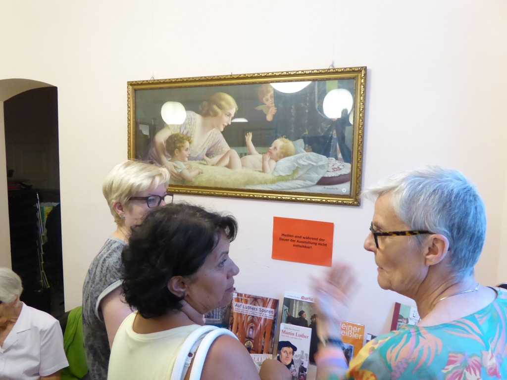 Unglaublich, was da so alles aus den christlichen Familien an Erinnerungsstücken zum Vorschein kam: Der breite und der schmale Weg, das große Schutzengelbild, die Konfirmationsblätter, Weihwasserbecken, Engel aus dem Erzgebirge, Engel auf Stempeln. Pfarrerin Kathinka Korn bei der Vernissage |