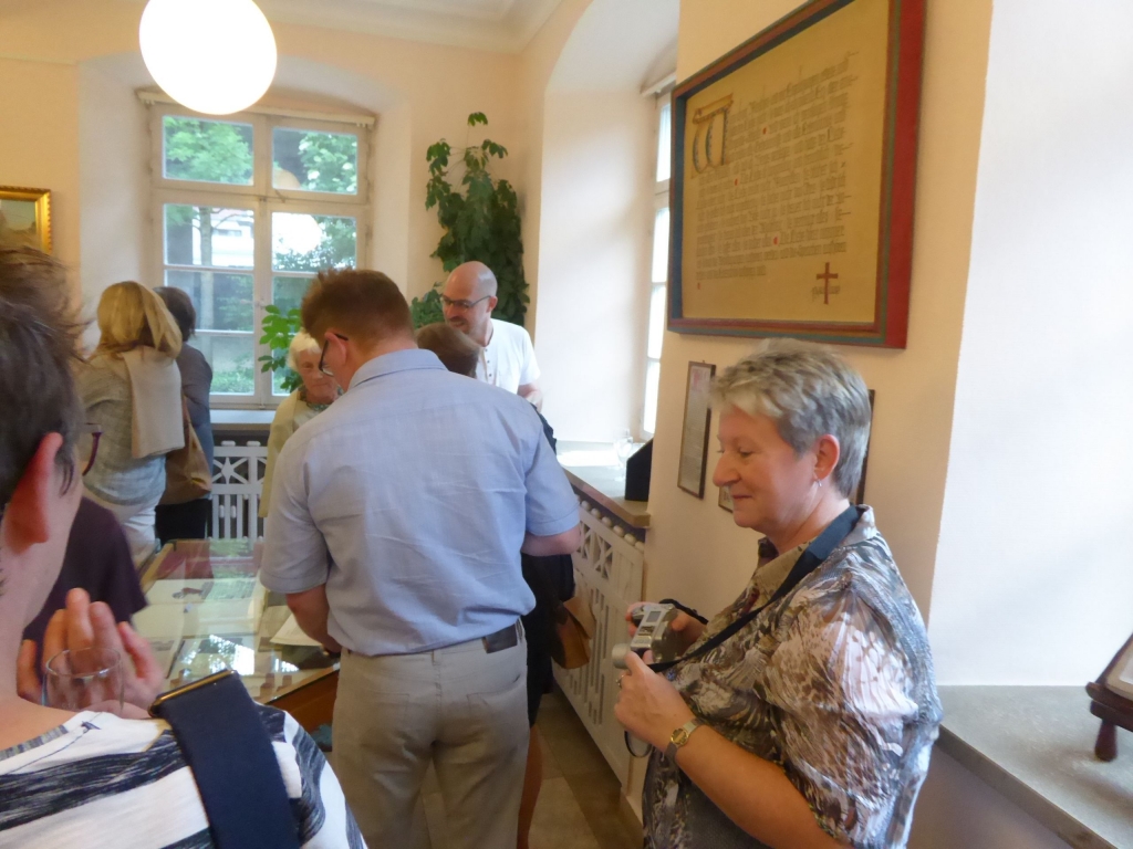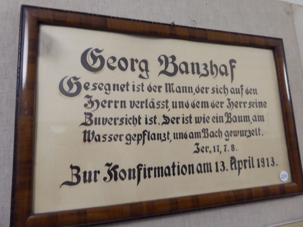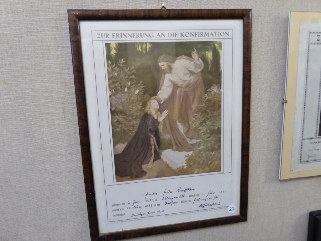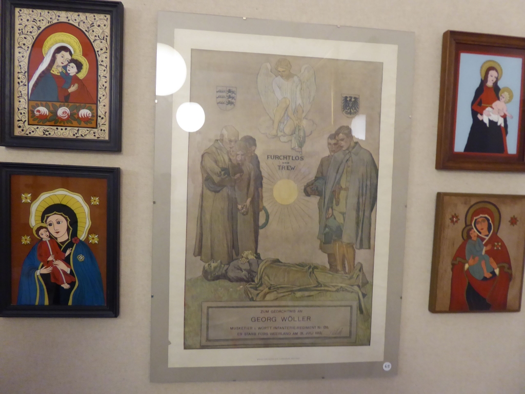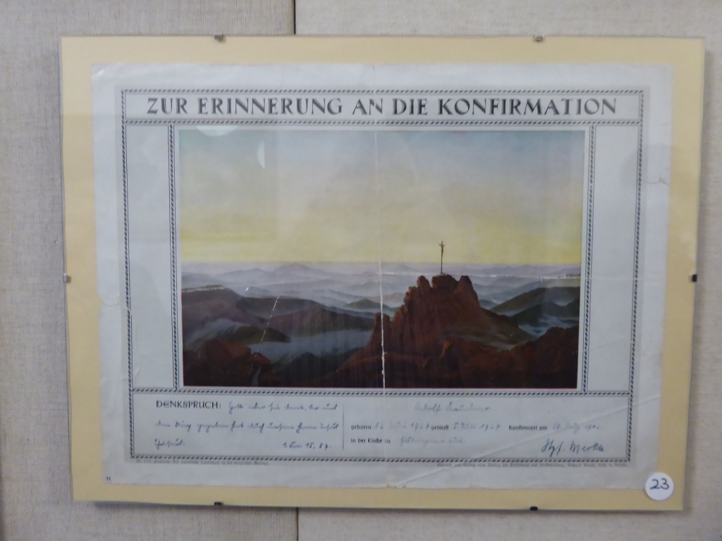 Unglaublich, was da so alles aus den christlichen Familien an Erinnerungsstücken zum Vorschein kam: Der breite und der schmale Weg, das große Schutzengelbild, die Konfirmationsblätter, Weihwasserbecken, Engel aus dem Erzgebirge, Engel auf Stempeln. Pfarrerin Kathinka Korn bei der Vernissage |