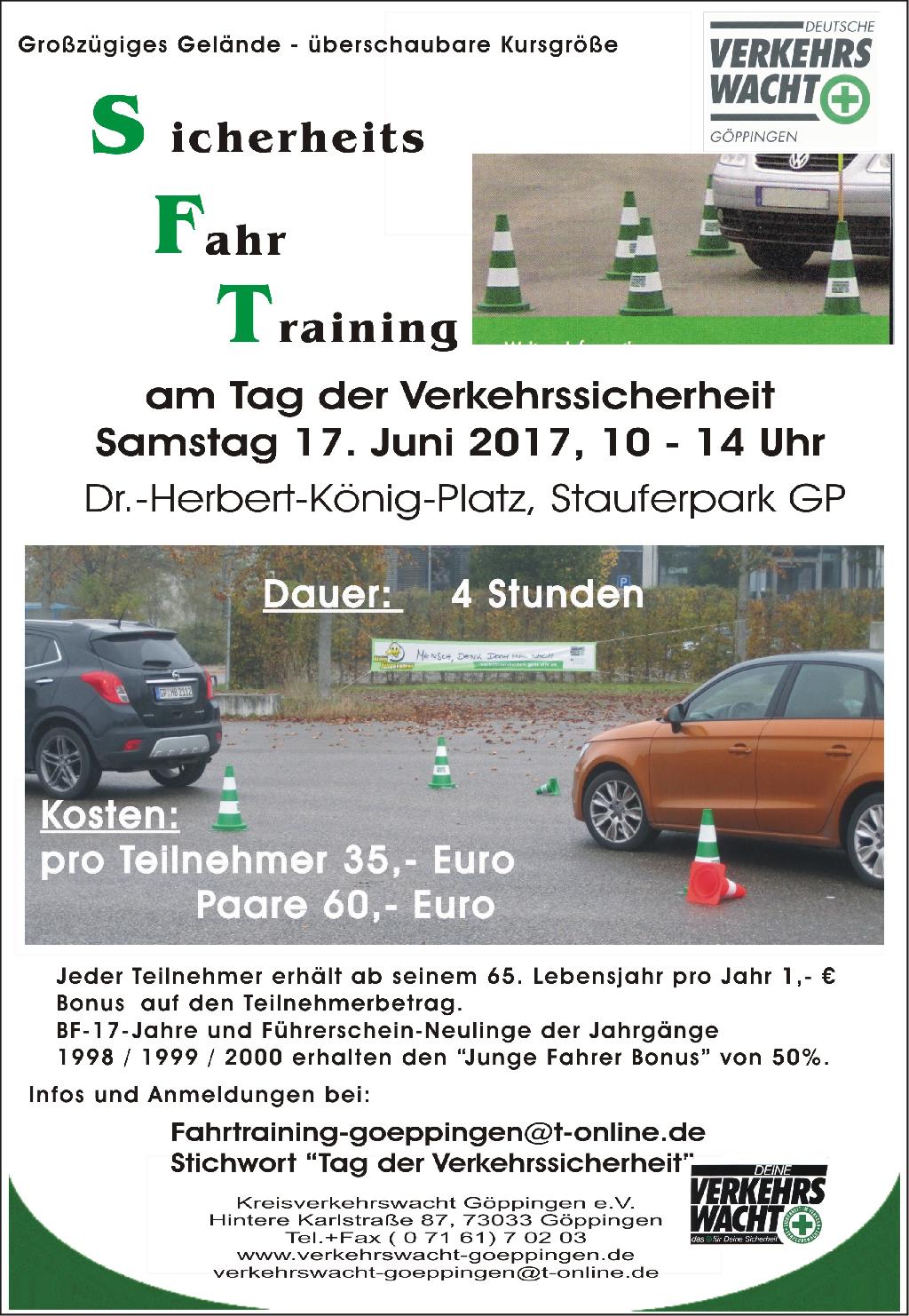 Vor Jahren wurde der Führerschein gemacht und das war es dann. Fort- oder Weiterbildung? Um in der hektischen Zeit und der entsprechenden Situation im Straßenverkehr bestehen zu können, veranstaltet die Kreisverkehrswacht Göppingen e.V. am Samstag, den 17. Juni 2017, ein Fahrtraining „zum Tag der Verkehrssicherheit“ im Stauferpark auf dem Dr.-Herbert-Königplatz.