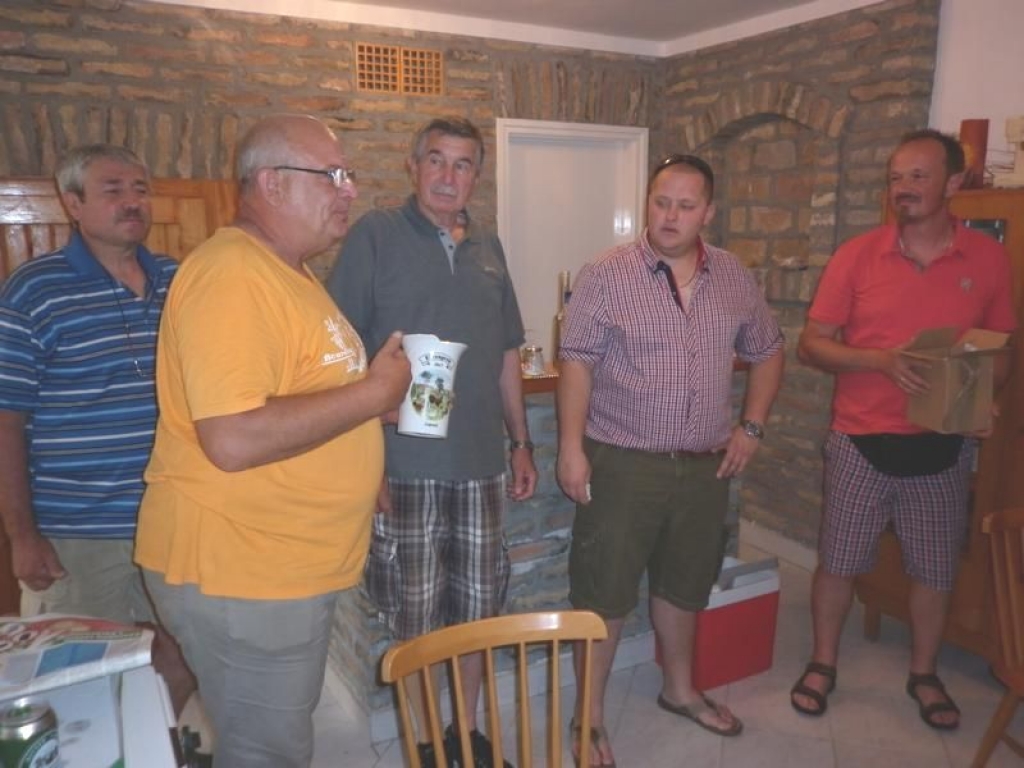 Nun fuhren wir zum Highlight des Tages, zunächst auf unwegsamen Gelände bis zu einem Deich, den Joni uns vorausfahrend auch befuhr. Dahinter erstreckte sich ein idyllisch gelegener See mit einem kleinen Fischerheim. Dort bewirteten uns Jonis Bekannter und seine Fischerkollegen standesgemäß mit Fischsuppe und Lammgulasch (4. Gulasch). Die Vorstandschaft (1. Vorsitzender, Kassier und Jugendleiterin/Pressewartin) unternahm danach eine ausgedehnte Bootstour über den See, bei der wir einige seltene Vogel – und Entenarten sahen, wie zum Beispiel Krickenten und Bienenfresser. Stefan Raindl verschaffte sich mit einem Sprung ins kühle (lauwarme) Nass etwas Abkühlung. Wir danken Joni und seinen Bekannten für dieses wunderschöne Erlebnis. Nun besuchten wir unseren Zuchtfreund Gyuri Folcz und seine Malteser - und Mokeetaubenzucht in Villany. Danach fuhren wir zu einem Brieftaubenzüchter in Villany, der uns von 4 Tauben berichtete, die vor ein paar Jahren vom Stauferland wieder zurück in ihrem Heimatschlag gefunden haben. Das sind ganze 1.070 km!